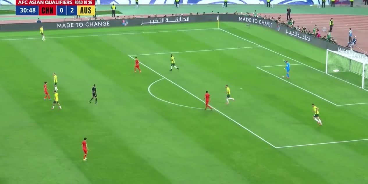 比賽第16分鐘,傑克遜·歐文禁區前沿打門被封堵,隨後黃政宇解圍滑倒被對手搶斷,傑克遜·歐文再兜射遠角入網,國足0-1澳大利亞隊。