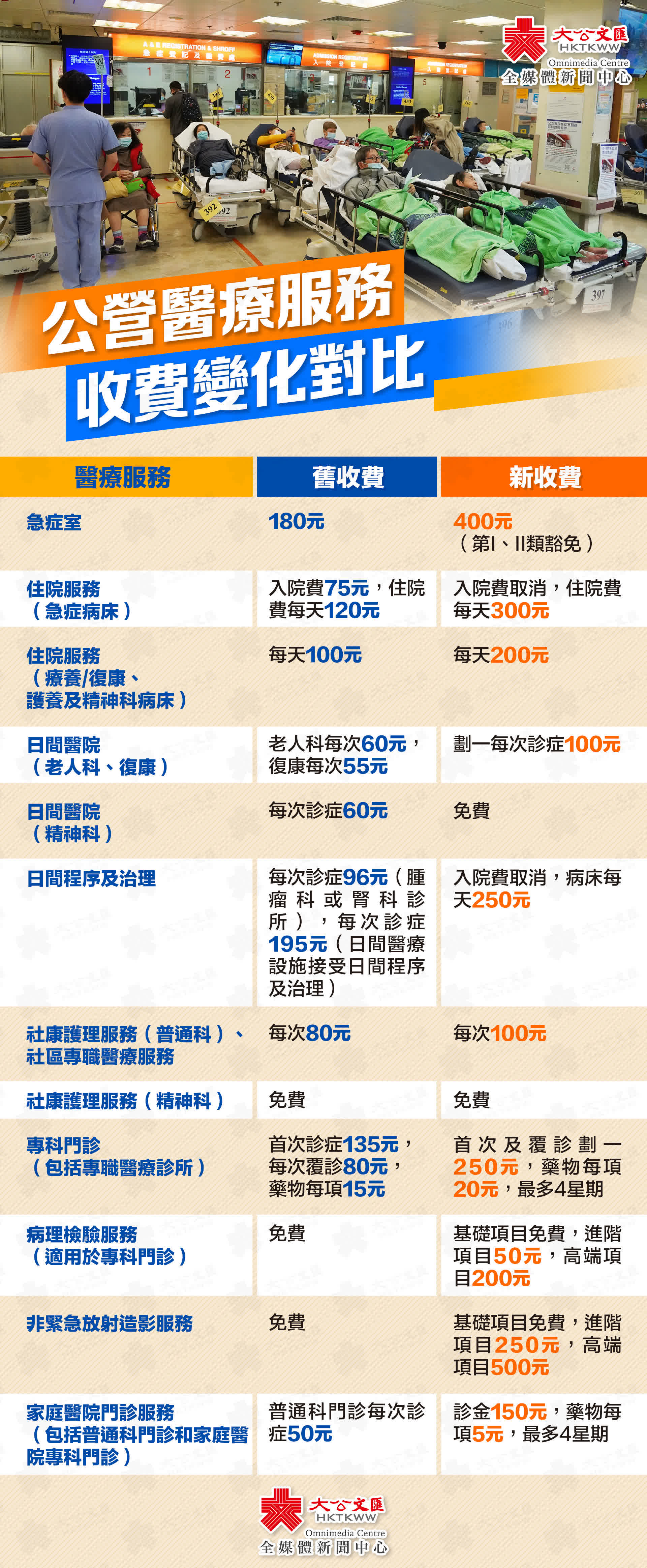調整後,急症醫院住院病床的收費由每日120元增至每日300元;療養/復康、護養及精神科病床,每日收費由100元增至200元。門診服務方面,普通科門診的收費由50元增至150元,並會收取每種藥5元給予最多4星期的份量;專科門診費用亦會調升,每次診症收費250元,藥費收每種藥20元,最多處方4星期的份量。