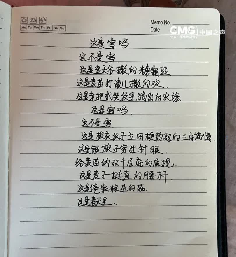 沒有濾鏡,沒有美顏,視頻裏的「二姐」素麵朝天,穿着最家常的小方格棉衣,右手托着一把剛下的春雪,笑盈盈地讀着剛寫完的詩。「我的家鄉一個冬天都沒下雪,一看下了雪,我說麥子有救了,麥子有救了呀!我躺在被窩裏沒起,就在那兒寫。」一寫完,呂玉霞裹上棉衣揣起手機就往雪地裏跑,早飯都顧不得吃,「就怕雪化了」。