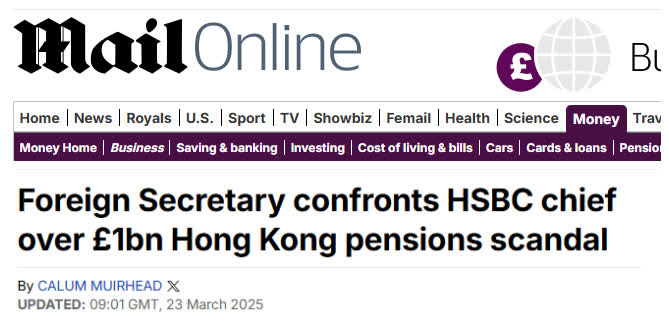 英國媒體「星期日郵報(Mail on Sunday)」3月23日報道指,獲得一封於2024年8月,由英國外交部中國事務副主任致函駐港高級英國外交官的電郵,內容為英國外交發展大臣戴維·拉米(David Lammy)與滙豐控股(HSBC)主席杜嘉祺(Mark Tucker)一次會談時,當面質詢滙豐控股凍結移英港人近100億港元的香港強積金退休金儲蓄一事。
