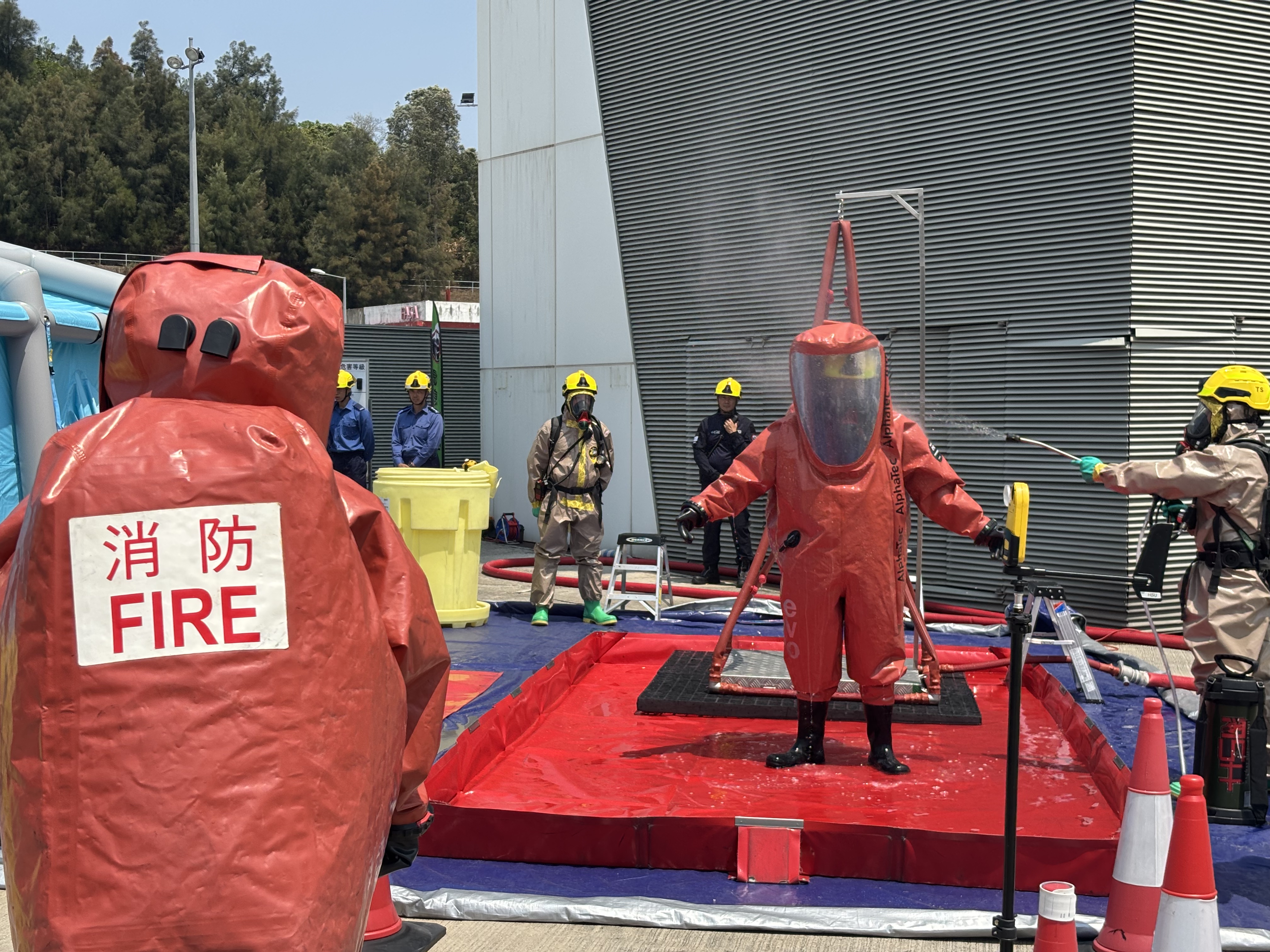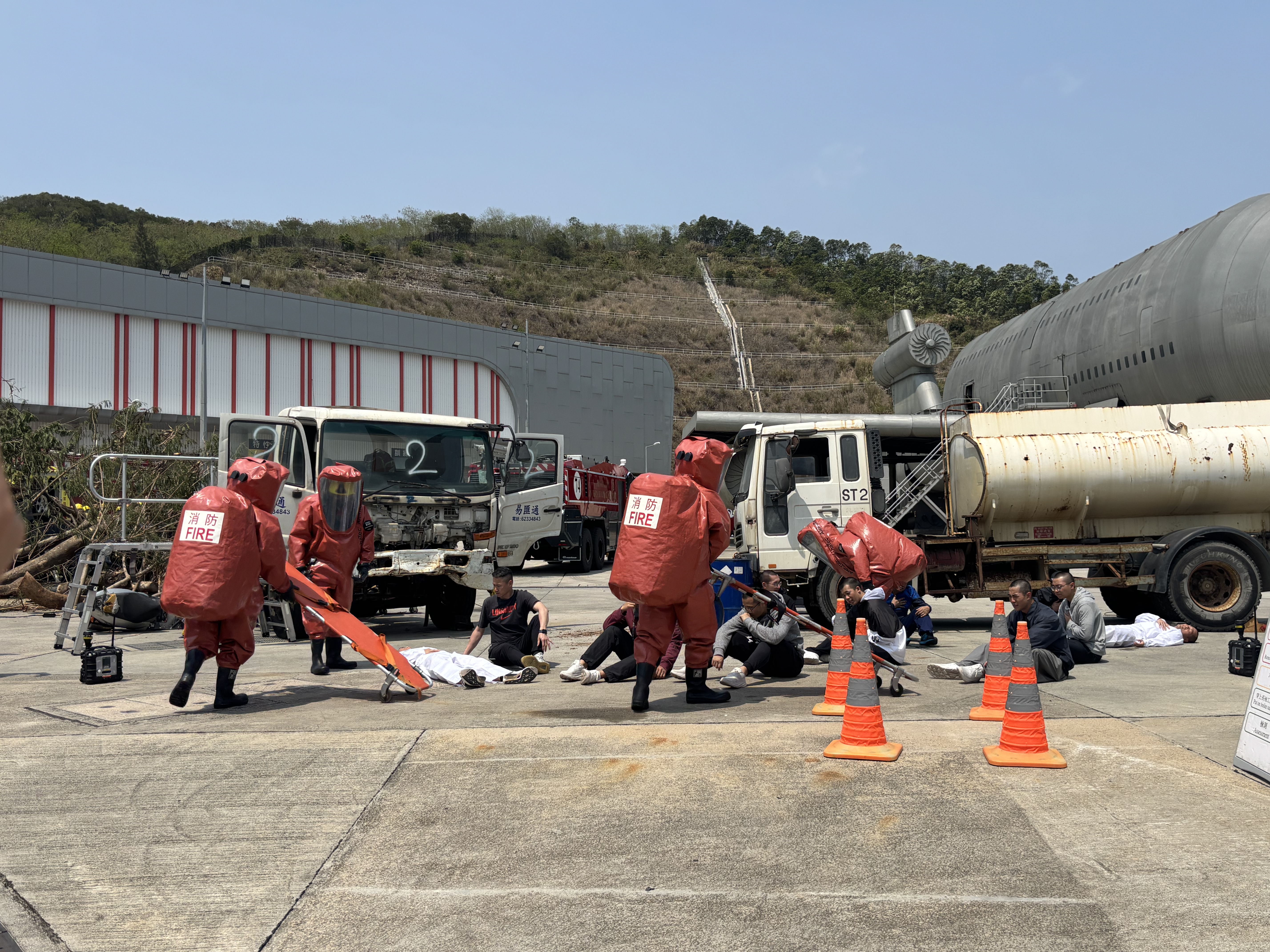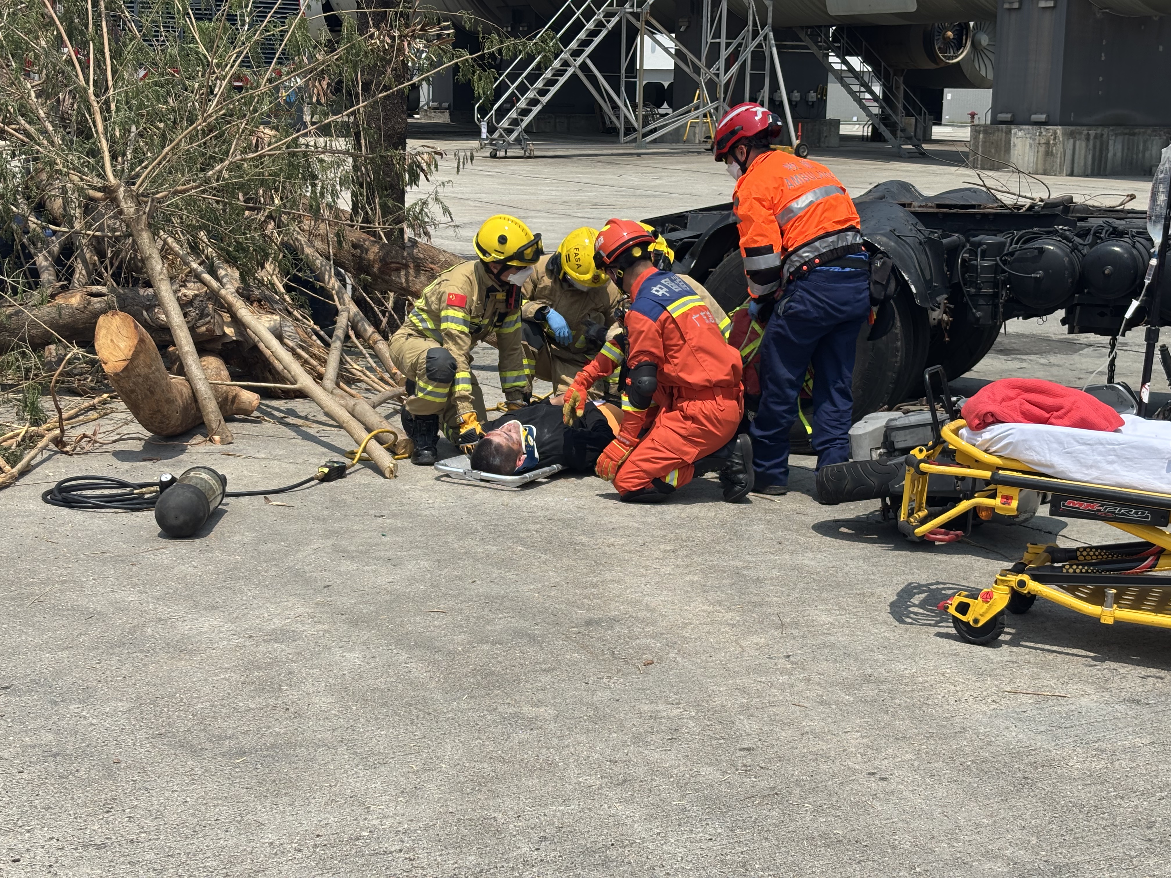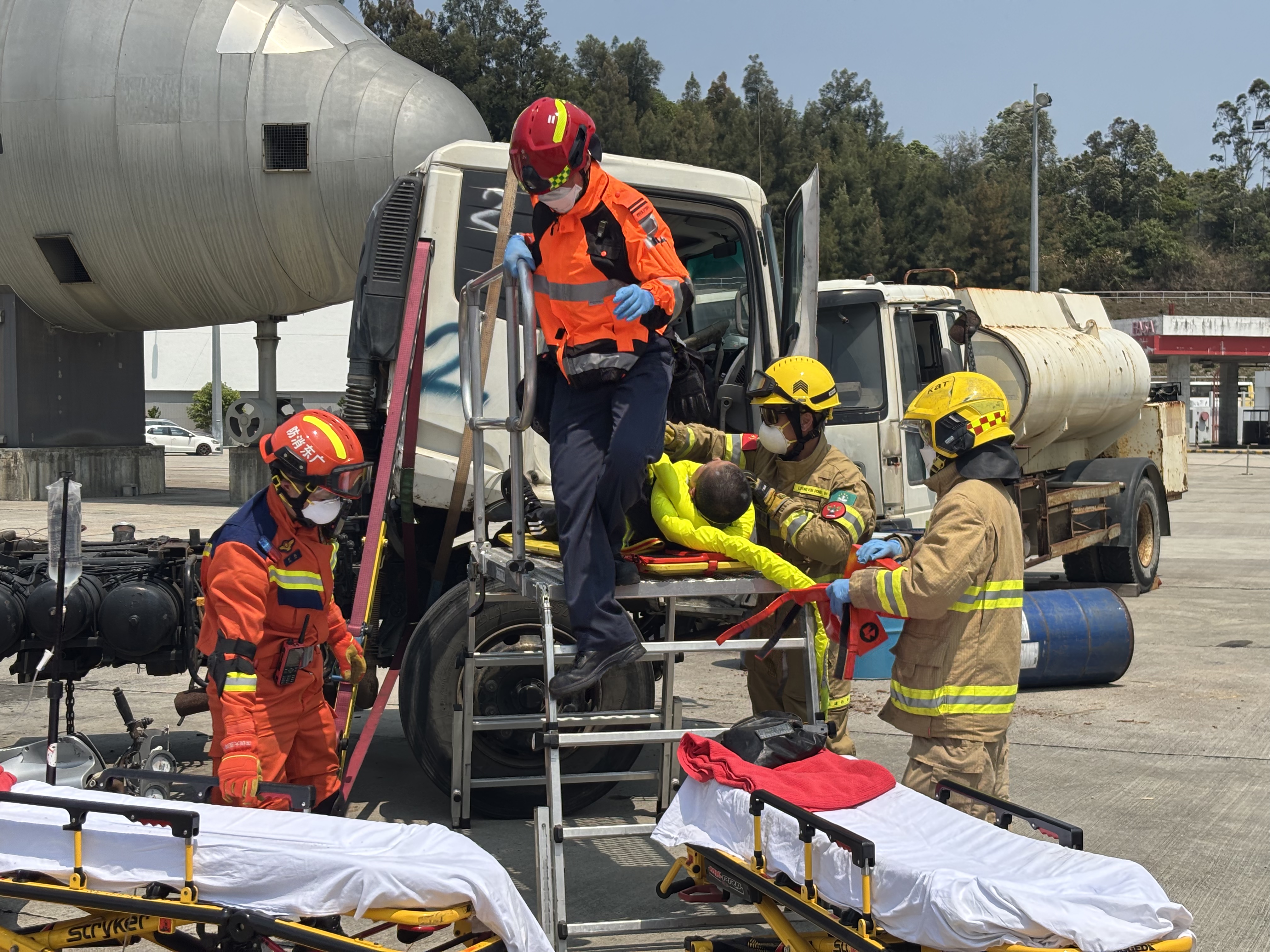 第二場景考驗公路多重事故應變,設定在颱風導致樹木倒塌擊中危險品運輸車,引發連環追撞與化學品洩漏。香港公路及鐵路拯救專隊運用樹鏈鋸開闢救援通道,以高壓起重氣袋抬升15噸重車輛救出受困駕駛,同時危害物質專隊啟動四通道充氣洗消帳篷,配備熱水爐與便攜式洗消裝置,90分鐘內完成50名污染者除污。演練凸顯粵澳港三地在特種破拆工具與火災應急程序的技術整合。