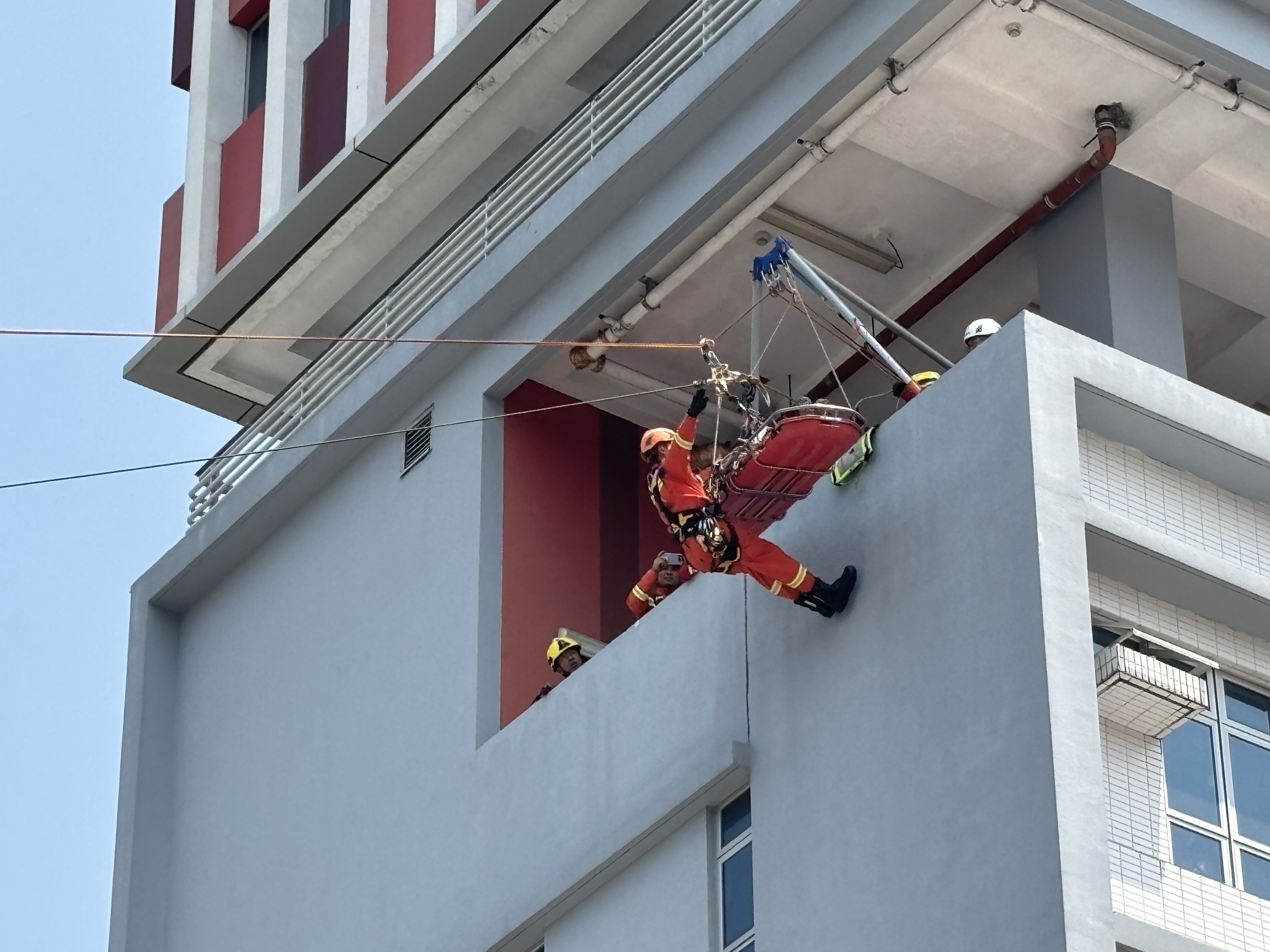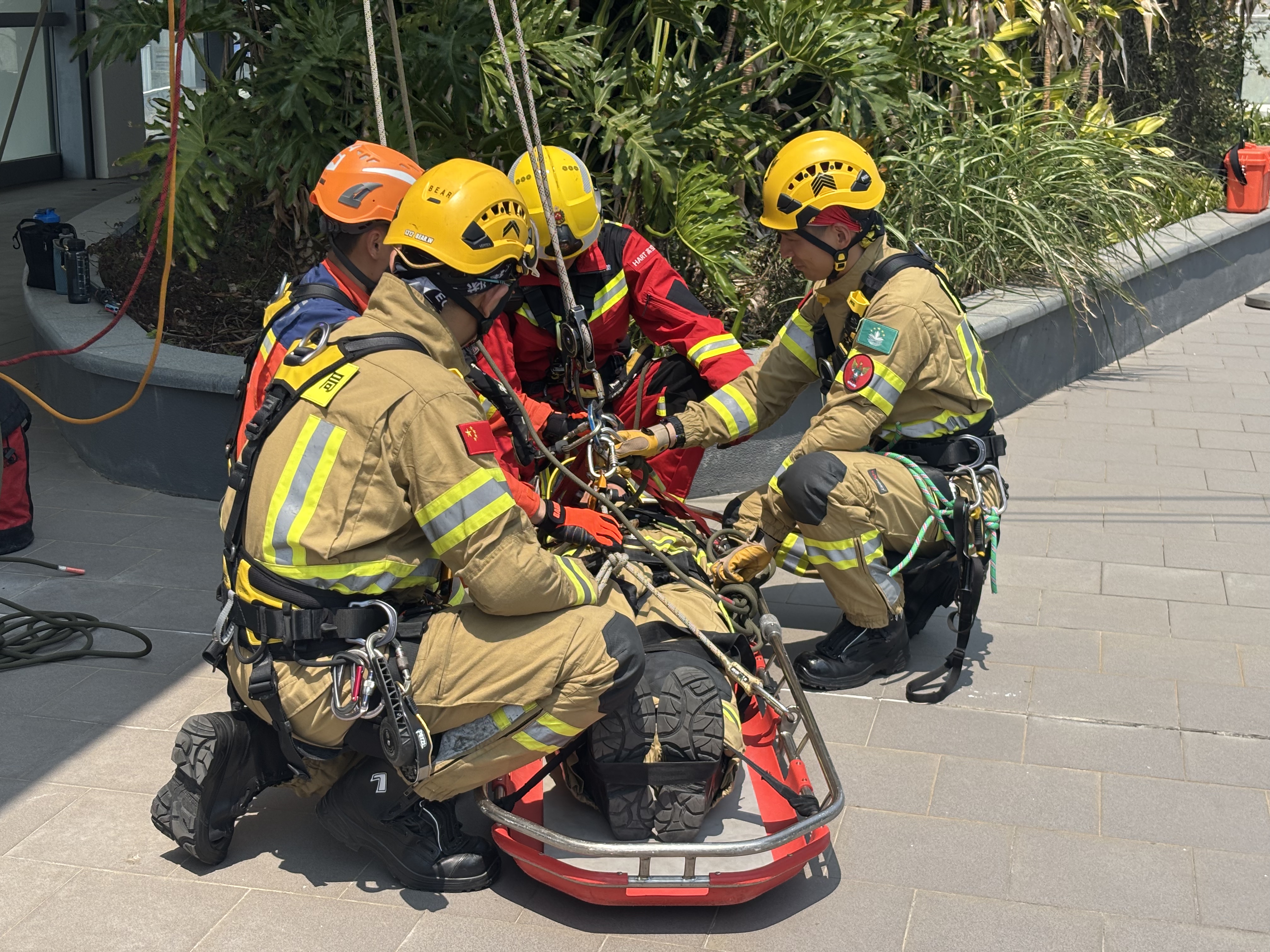 首場演習模擬颱風引發山洪暴發,設定兩名登山者受困山腰,其中一人遭倒塌樹木壓傷。由香港消防處主導行動,調度高空拯救車搭建橫跨30米的繩橋系統,廣東救援隊運用多功能三腳架固定傷者擔架,以電動上升器穿越模擬洪流,澳門隊伍則在對岸接應並完成護送。演練首次整合三地高空救援標準流程,驗證惡劣地形下傷患轉運的無縫銜接。