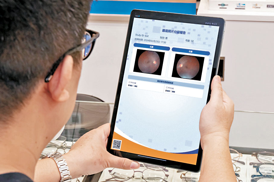 何明光表示,「糖尿上眼」理論上是百分之百能檢查出來,但數據顯示,由於在公立醫院需要長時間輪候,導致只有約20%的糖尿病患者得到檢查是否患糖尿眼的機會,餘下八成患者是未接受檢查的,「這是一個很大的問題。」為此,其團隊研發出自動便攜式眼底相機、AI識別和分析系統,該相機無須專業人員操作,可自動對準眼睛拍照,被檢查者亦無須使用放大瞳孔眼藥水或熒光素,只需1分鐘便可完成眼底相拍攝並生成分析報告。