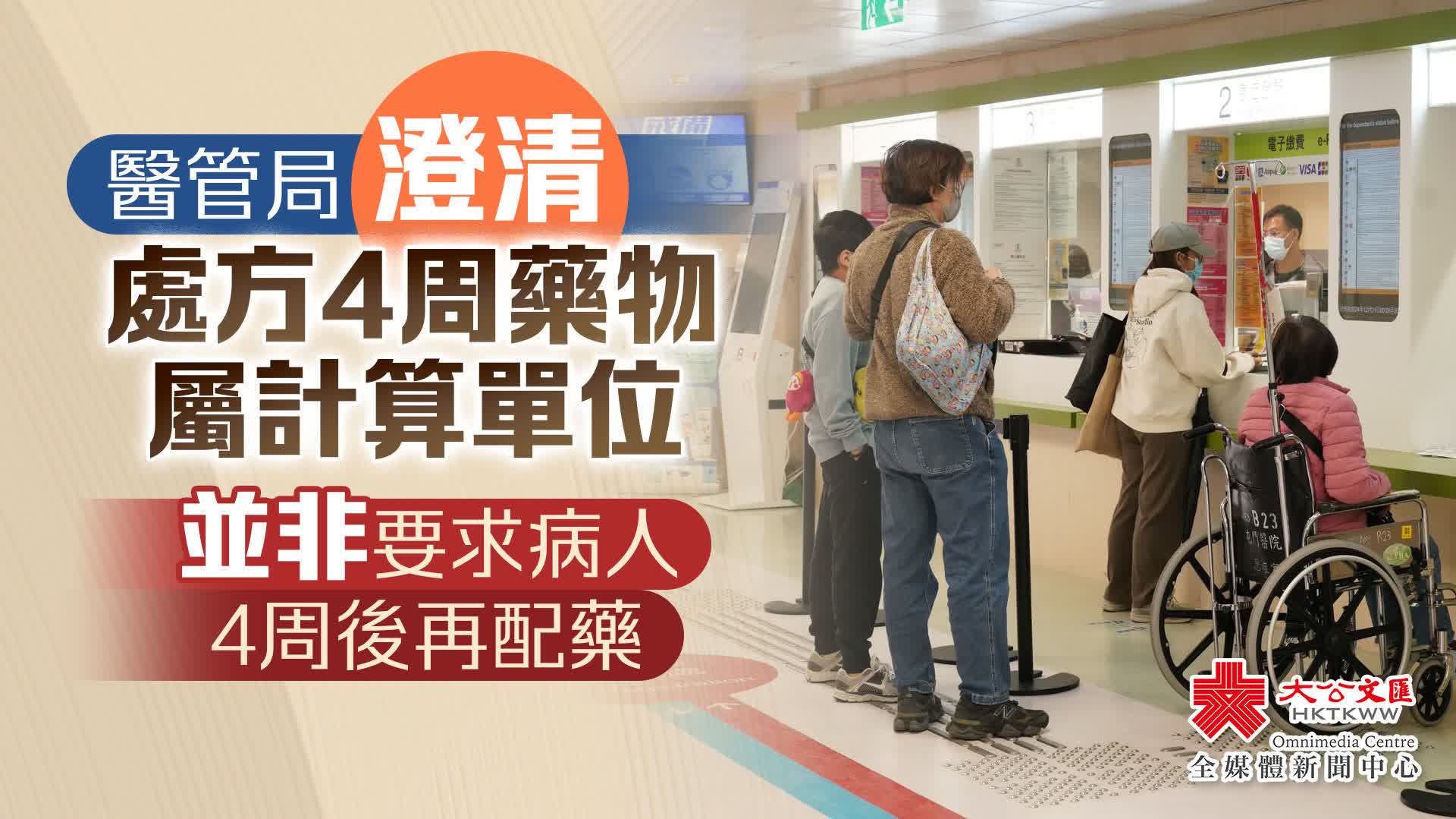 大公文匯全媒體報道,政府日前公布公營醫療服務收費改革方案,普通科及專科門診的藥物收費將會增加,而方案中「最多處方4星期藥物」的說法令不少市民誤解。醫管局總藥劑師崔俊明今日(27日)在電台節目澄清表示,最多處方4星期藥物的講法只是誤會,他解釋每4個星期是計算的單位,並非要病人於4個星期後再到醫院或診所配藥。
