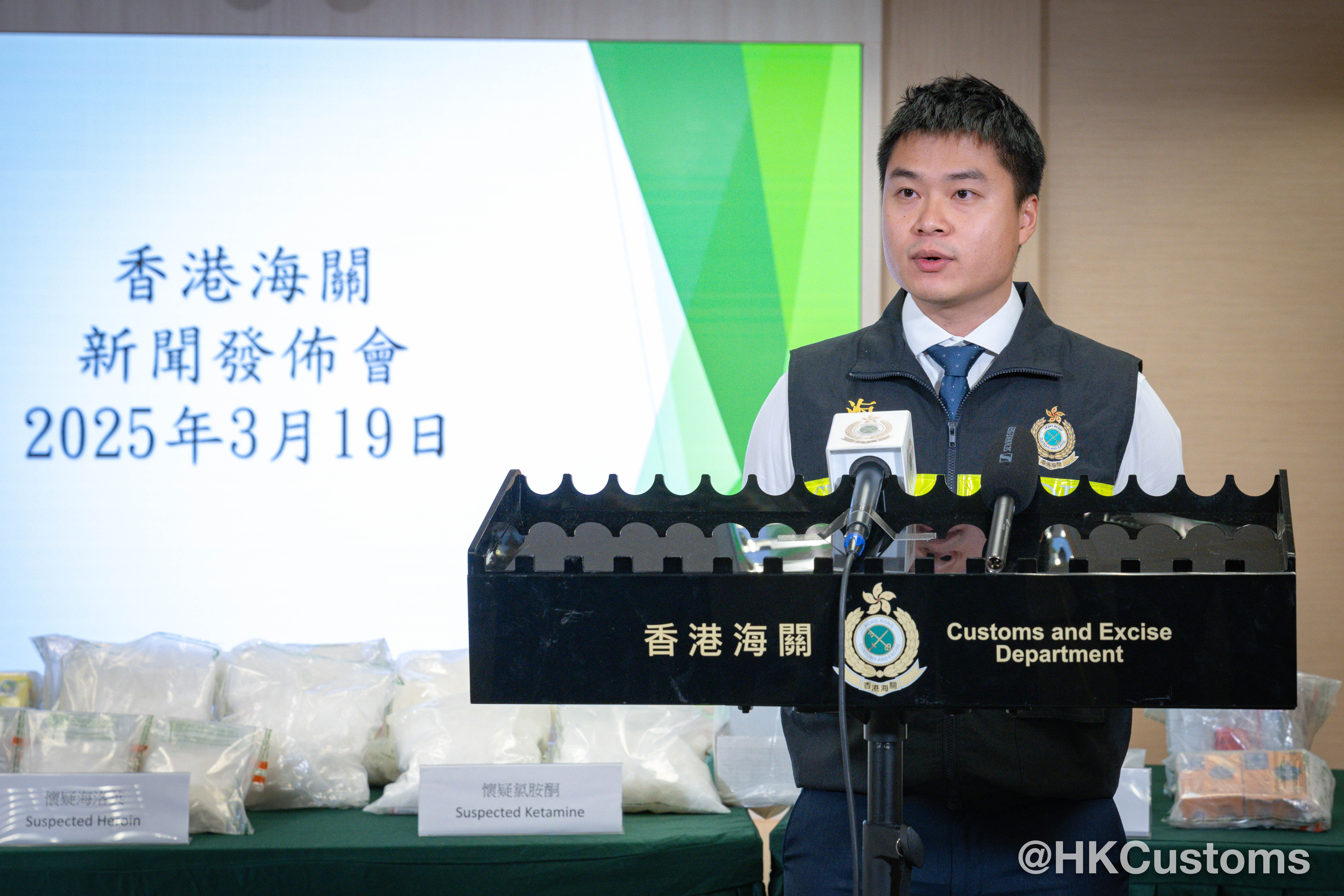 香港海關三月十八日在香港國際機場破獲三宗涉及貨運及旅客販運毒品的案件,檢獲共約四十公斤懷疑氯胺酮、約一百五十二公斤懷疑大麻花及約七百六十克懷疑海洛英,估計市值共約五千八百四十萬元。