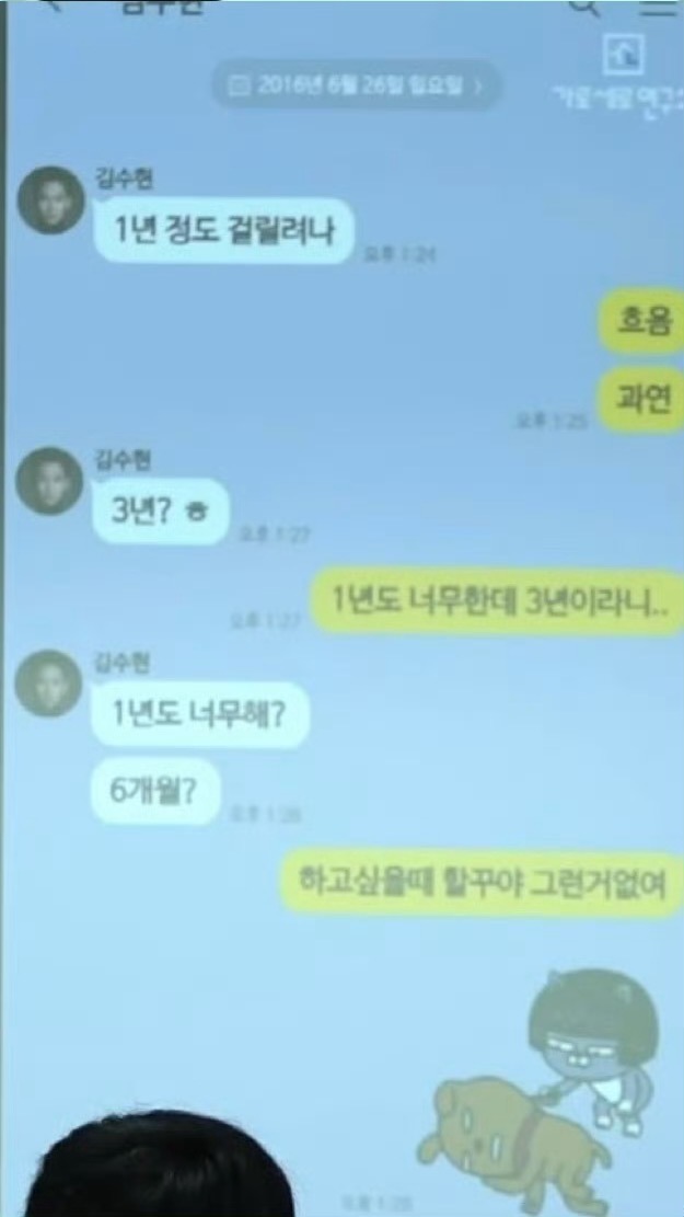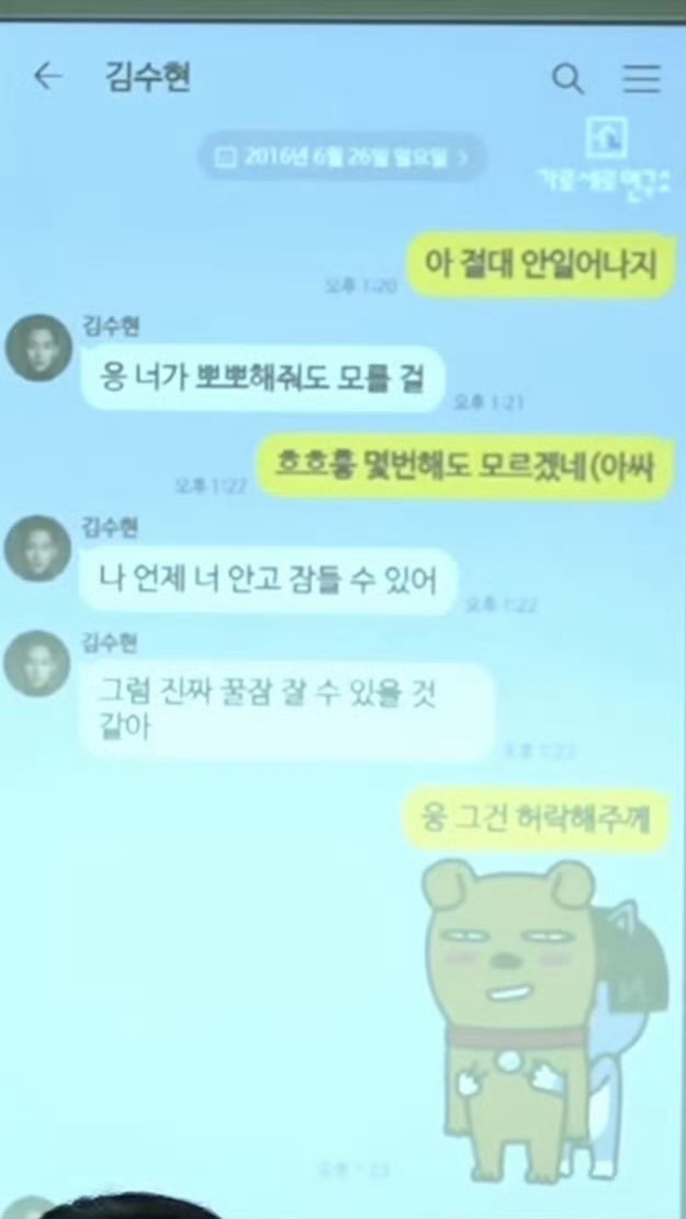 在兩頁聊天紀錄中,金秀賢不斷地表達了「想抱着未成年的金賽綸睡覺」的想法,兩人的對話十分親暱。兩頁聊天紀錄記載着如下內容: