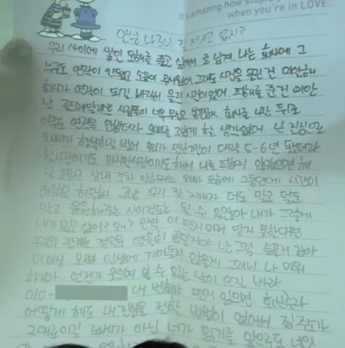 「如果這封信最終也無法送達你手中,那我們的關係可能真的會徹底結束吧。那樣的話,我會感到很難過。我不會再插手你的生活了,所以,請你不要再討厭我。我希望,總有一天,我們能笑着再見。010-xxxx-xxxx,這是我的號碼,讀到信後請回信。我已經找不到別的辦法傳達我的心意了,希望你的地址沒有變,希望這封信不是交到『退件』處理,而是由你親自讀到。」