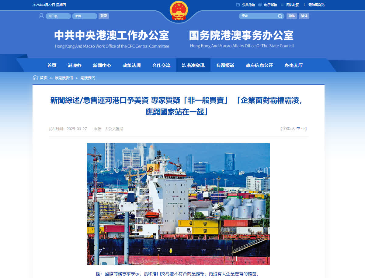 大公文匯網報道,長和計劃出售巴拿馬運河兩端港口資產事件持續引發熱議,3月27日,中共中央港澳工作辦公室、國務院港澳事務辦公室網站再次轉載《大公報》新聞綜述文章《急售運河港口予美資 專家質疑「非一般買賣」 「企業面對霸權霸凌,應與國家站在一起」》,文章引述社會各界人士評論,指出「面對美國的霸權和霸凌,更應該選擇和國家站在一起」,各界呼籲有關企業能從香港和國家發展乃至全人類共同價值的高度,慎重考慮交易。以下為評論文章全文: