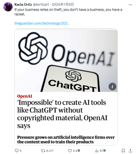 藝術家卡拉·奧爾蒂斯 (Karla Ortiz) 從小看着宮崎駿的電影長大,她正在起訴其他AI圖像生成器侵犯版權,目前案件仍在審理中,她稱這是「OpenAI等公司根本不關心藝術家的作品和藝術家生計的又一個明顯例子」。
