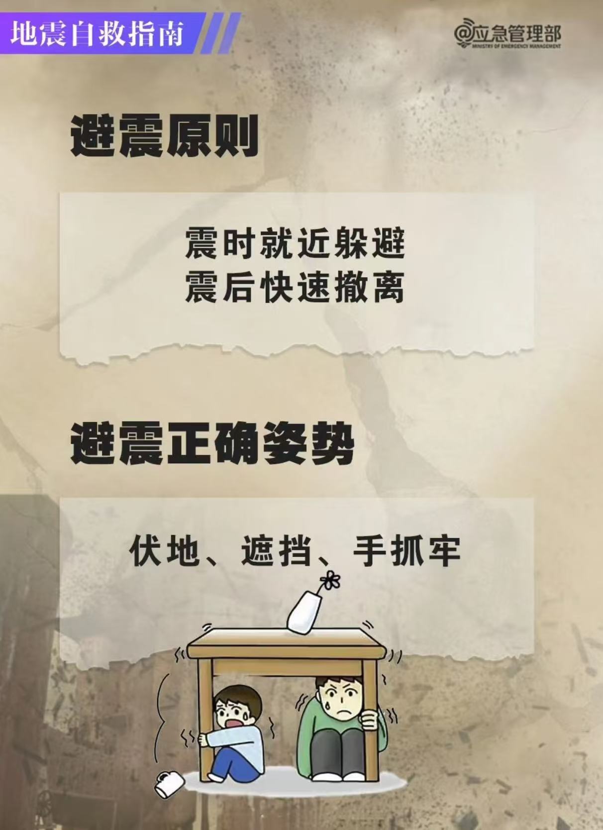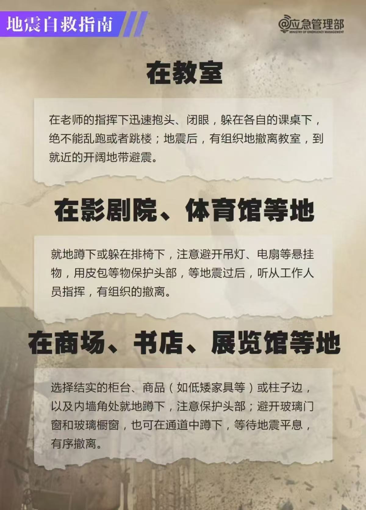 操場最安全:在操場或室外時,可原地不動蹲下,雙手保護頭部,注意避開高大建築物或危險物。