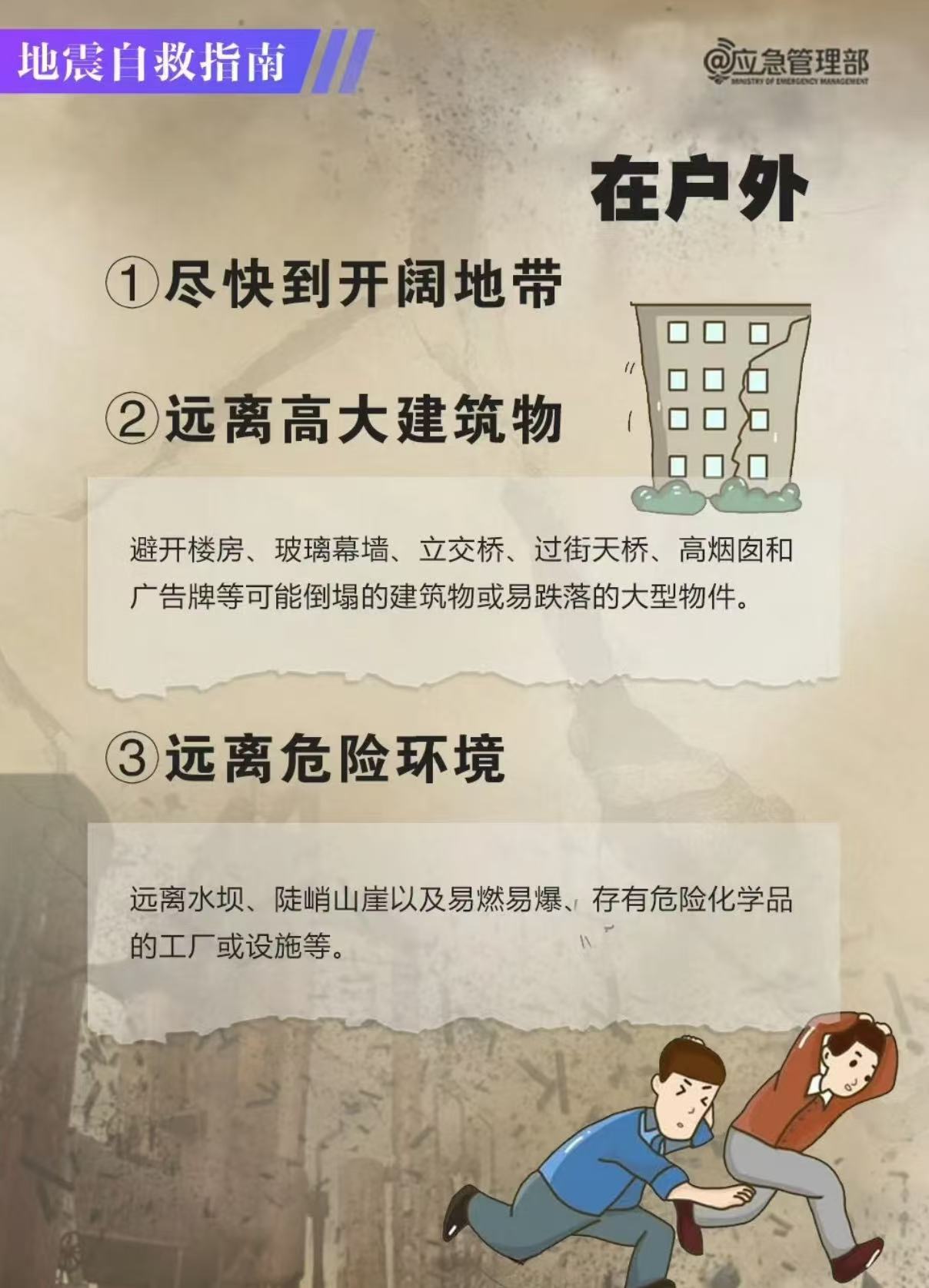 就近選擇開闊地:立即蹲下或趴下,以免摔倒;不要亂跑,避開人多的地方。