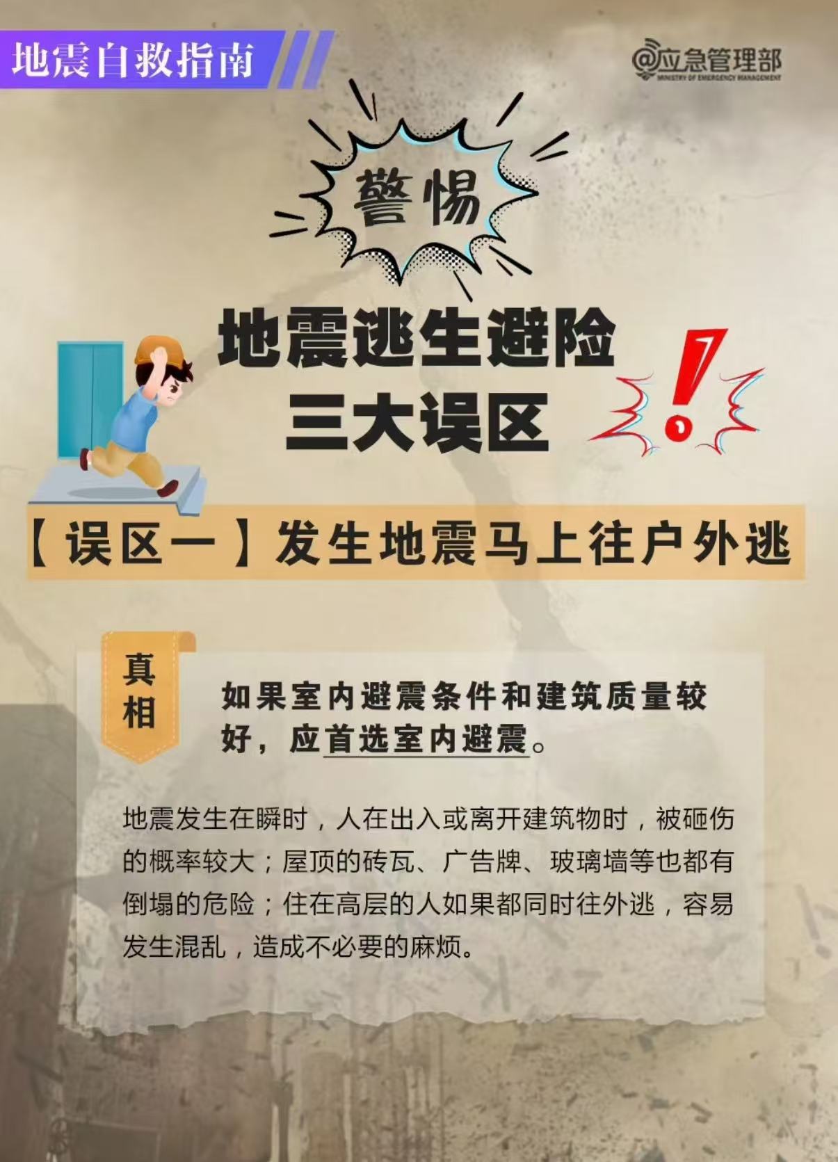 地震發生後,一定要往下跑嗎?答案是要看情況。尤其是對於高樓層住戶而言,往哪兒跑應遵循就近原則——離地面近就往地面跑,離樓頂近就往樓頂跑,總之,「見天見地」都能夠和外界接觸,相對更安全。