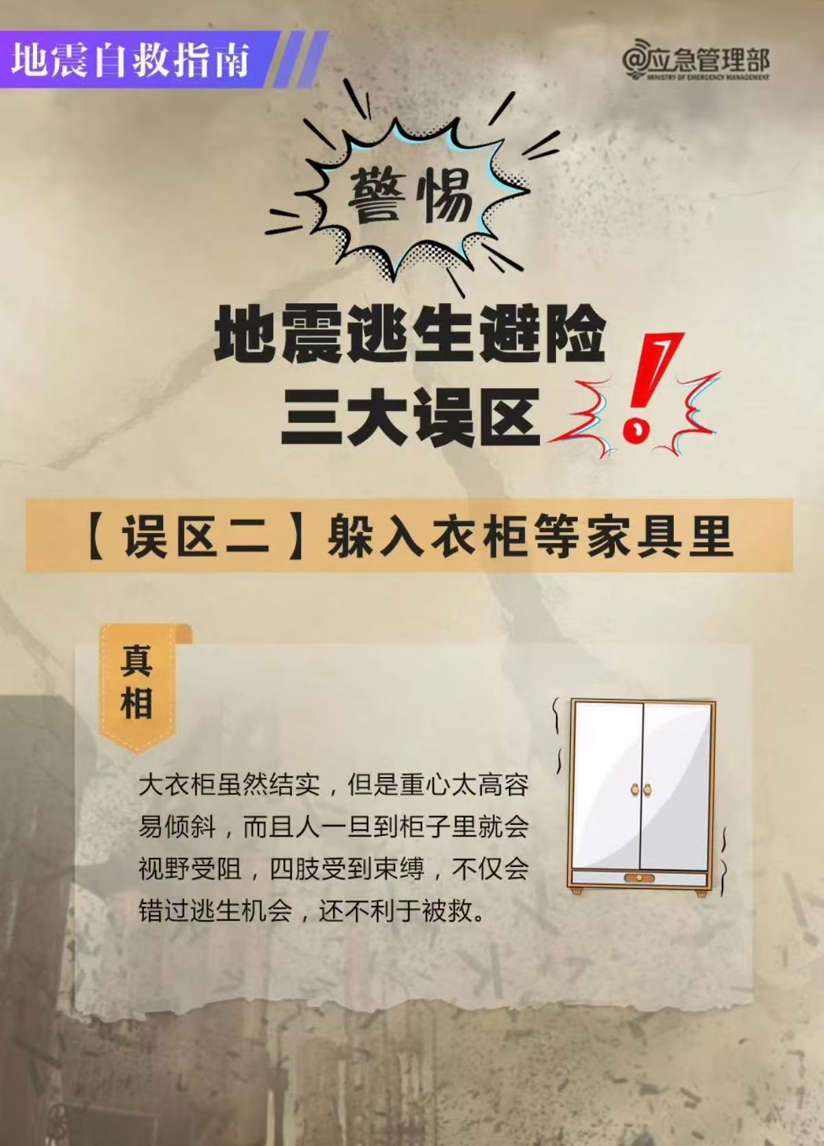 衣櫃絕不能進去:唐山大地震時,有人鑽進衣櫃躲藏,幾天後救援隊發現時,人是完好的,但最後憋死了。