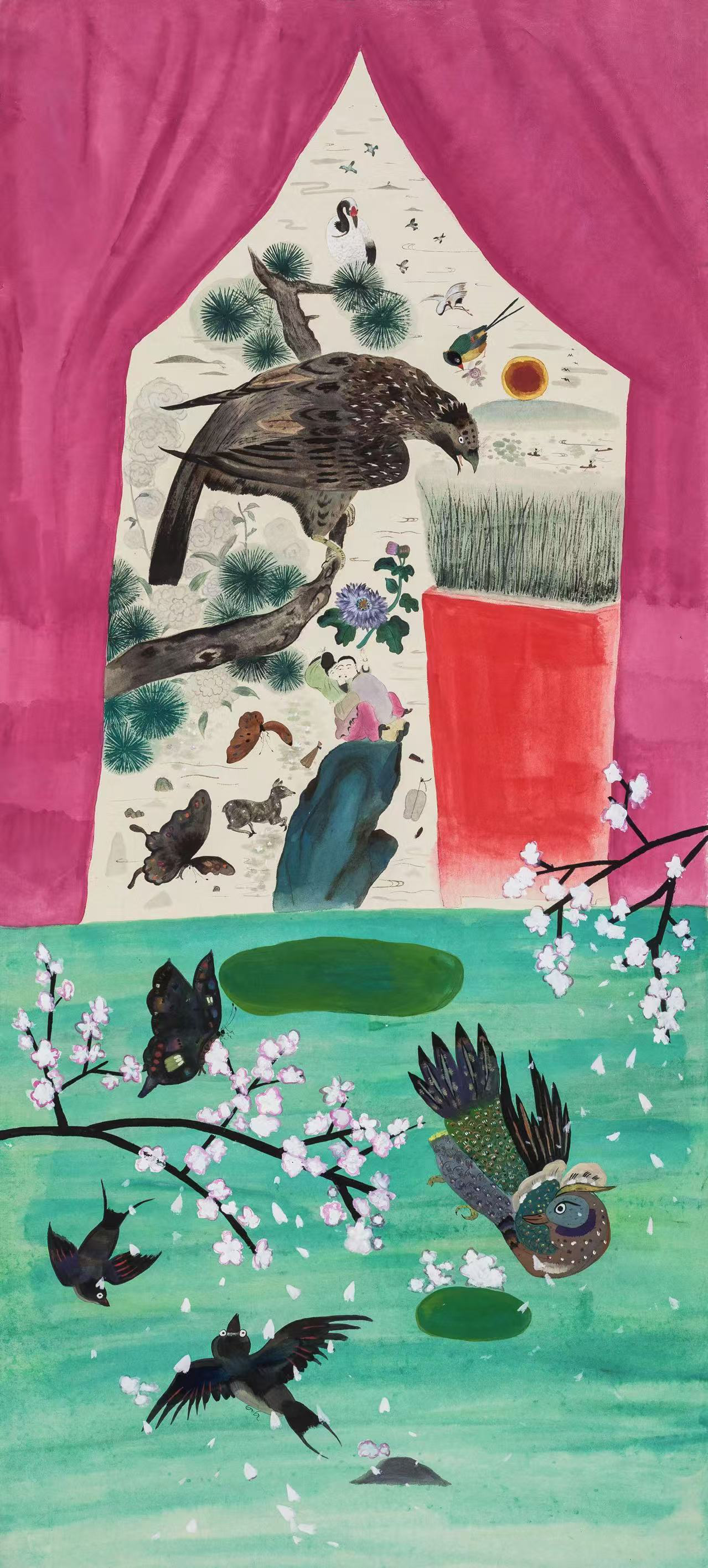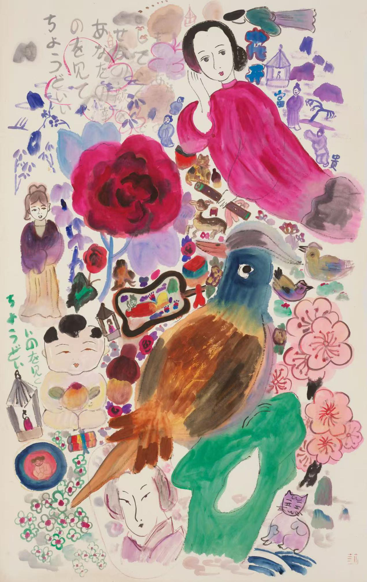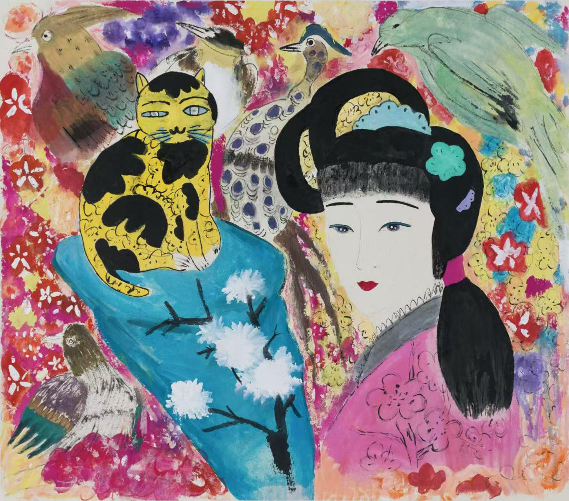 大公文匯全媒體報道,在當代水墨畫的領域中,王濛莎以其「夢境般的叛逆」獨樹一幟。她筆下的世界,蝴蝶大於人、石頭超越常理,色彩絢爛卻暗藏哲思。師承傳統卻不拘泥於古法,這位來自無錫的藝術家,以散點透視打破物理規律,用稚拙線條演繹心靈意象,更將禪宗哲學與現代審美熔於一爐。從長卷《五月寅日》的流動猛虎,到被劍橋收藏的《醉花間》之憂傷女子,她的作品既是對傳統水墨的顛覆,亦是對當代精神的回應。