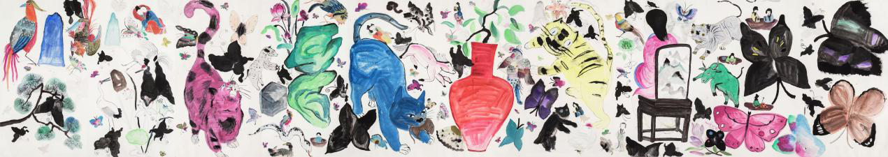 這幅長卷我也有所突破,比如將其懸掛於白立方空間時,觀眾既可從左往右賞析,也能從右往左品味。從遠處觀看,內心不禁為之澎湃,畫中的老虎、貓、獅子、花鳥蟲魚等動物,似乎都處於流動之中。由於畫作尺幅巨大,我作畫時的筆觸本身便帶有移動感。所以整幅畫給人以顫動之感,畫中的猛虎好似即將躍出宣紙。這對我而言,既是一次挑戰,也是傳統與當下觀看方式的巧妙融合。