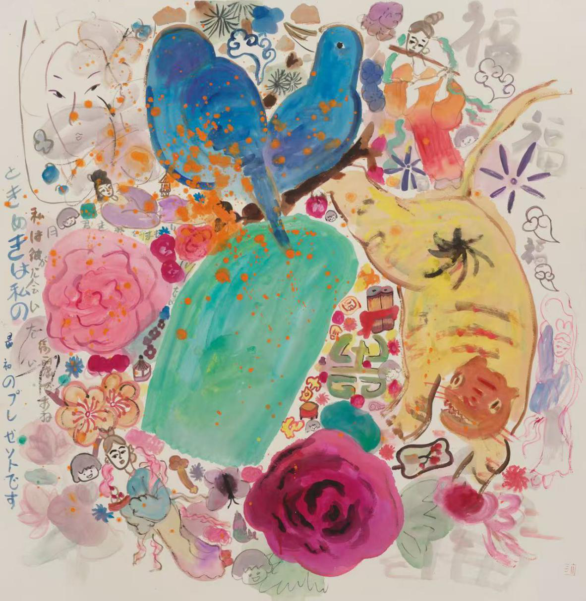 王濛莎:我深感,接觸不同媒介,使我得以突破對傳統繪畫的固有認知。電影中的蒙太奇手法,動畫裏一幀一幀的節奏感,都讓我意識到:繪畫並非靜止不動的藝術形式。這些經驗讓我更直觀地體會到作品本身蘊含的蓬勃活力。在我的繪畫作品中,能感受到一種獨特的流動感。以《五月寅日》為例,畫中所有的老虎、鳥獸似乎都在流動,充滿生機。因此,我期望我的作品不局限於敘事功能,而是着重展現點、線、面本體組合所產生的藝術魅力。簡而言之,即便作品呈現在一張平面紙張上,我也希望觀者能從中感受到更豐富、更立體的內涵。