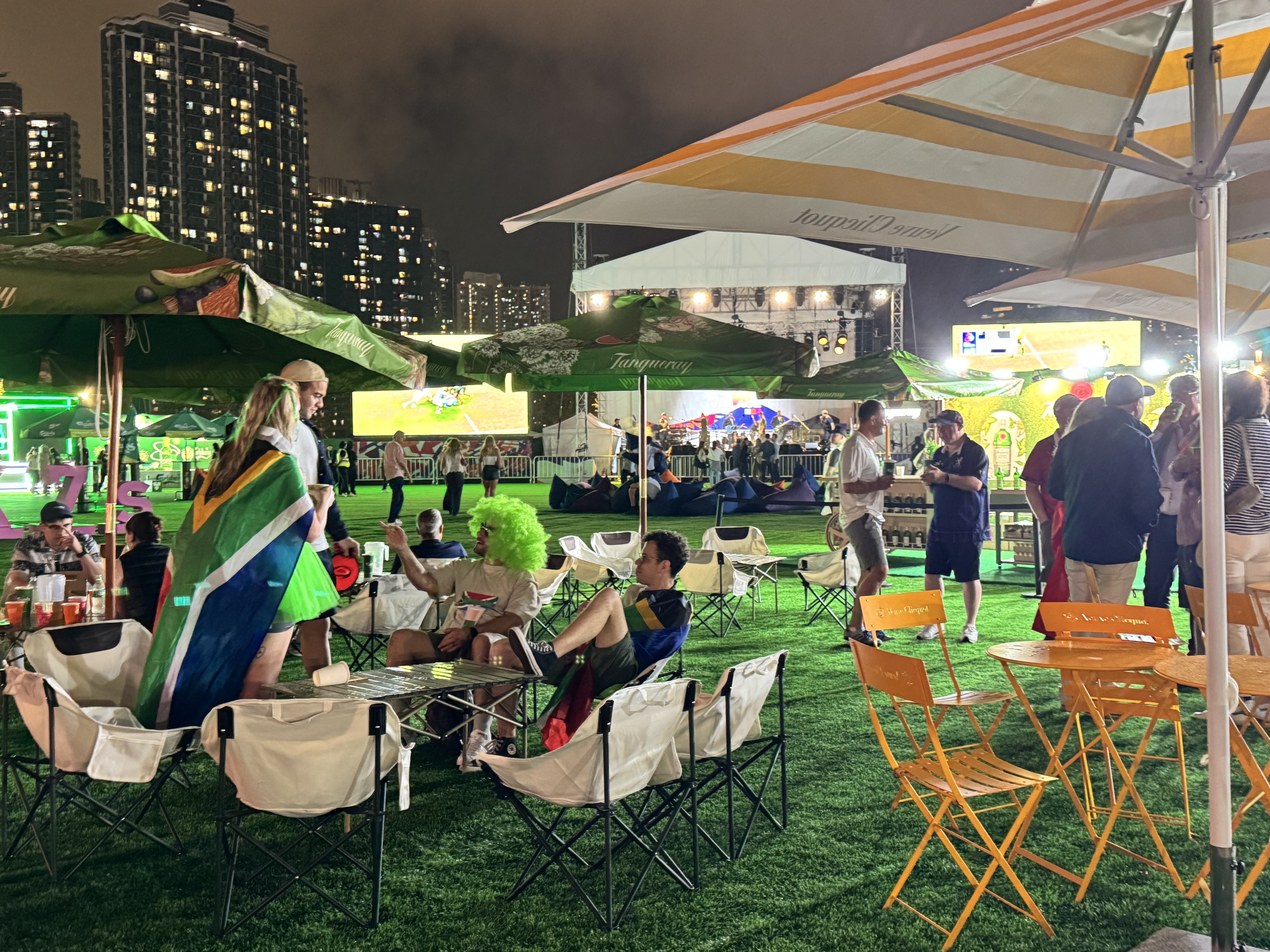 今日(28日)是七欖開賽首日,球迷熱情高漲,不少人在觀賽時舉杯暢飲。球迷不僅可以在啟德主場館內買到啤酒飲料,亦能在球迷村暢飲。今天稍晚時天空飄起毛毛細雨,但仍有不少球迷在雨棚下聊天、觀賽及飲酒。主舞台兩側的大屏放映主場館的賽事直播,球迷可換個環境享受觀賽樂趣。