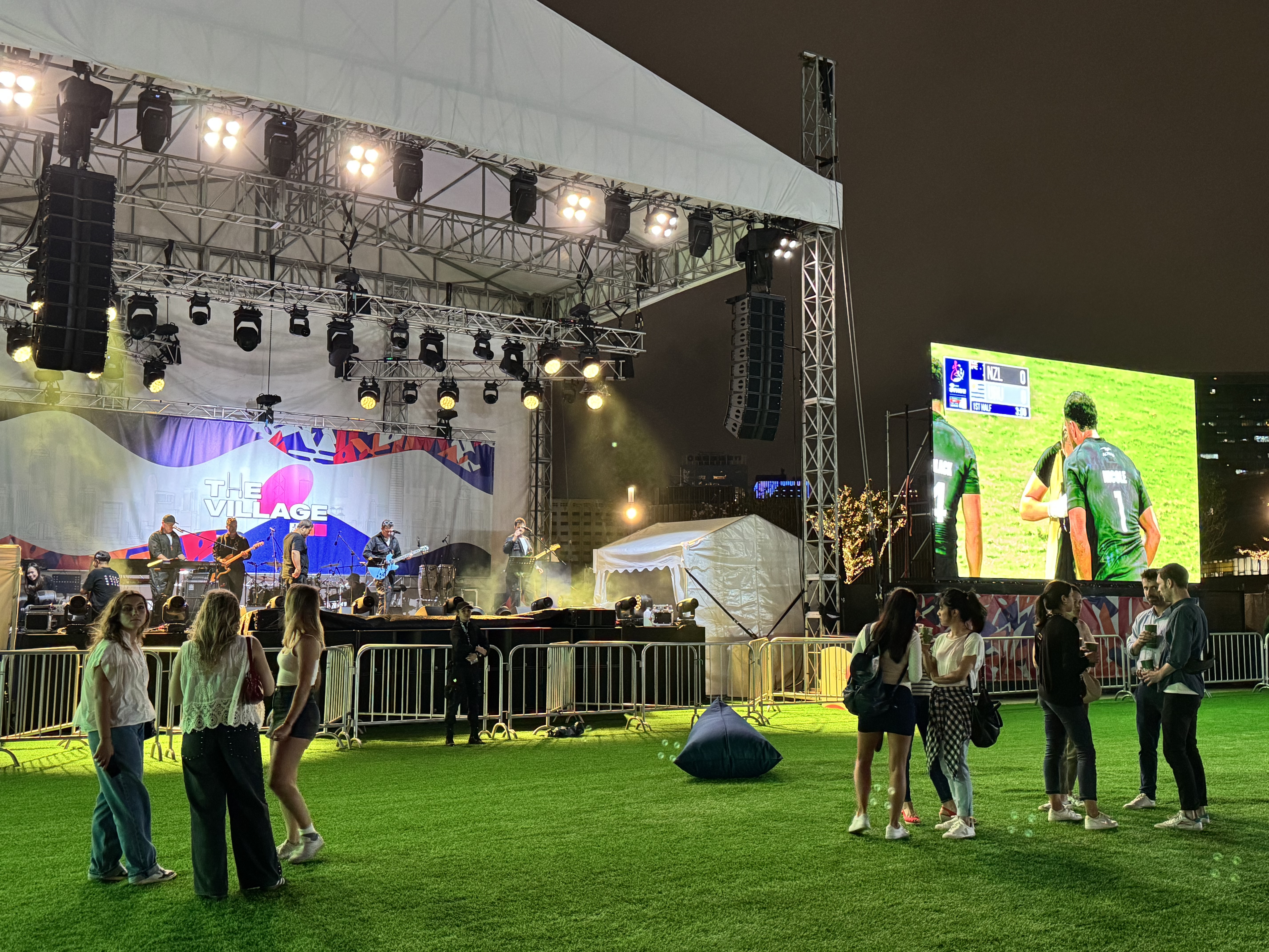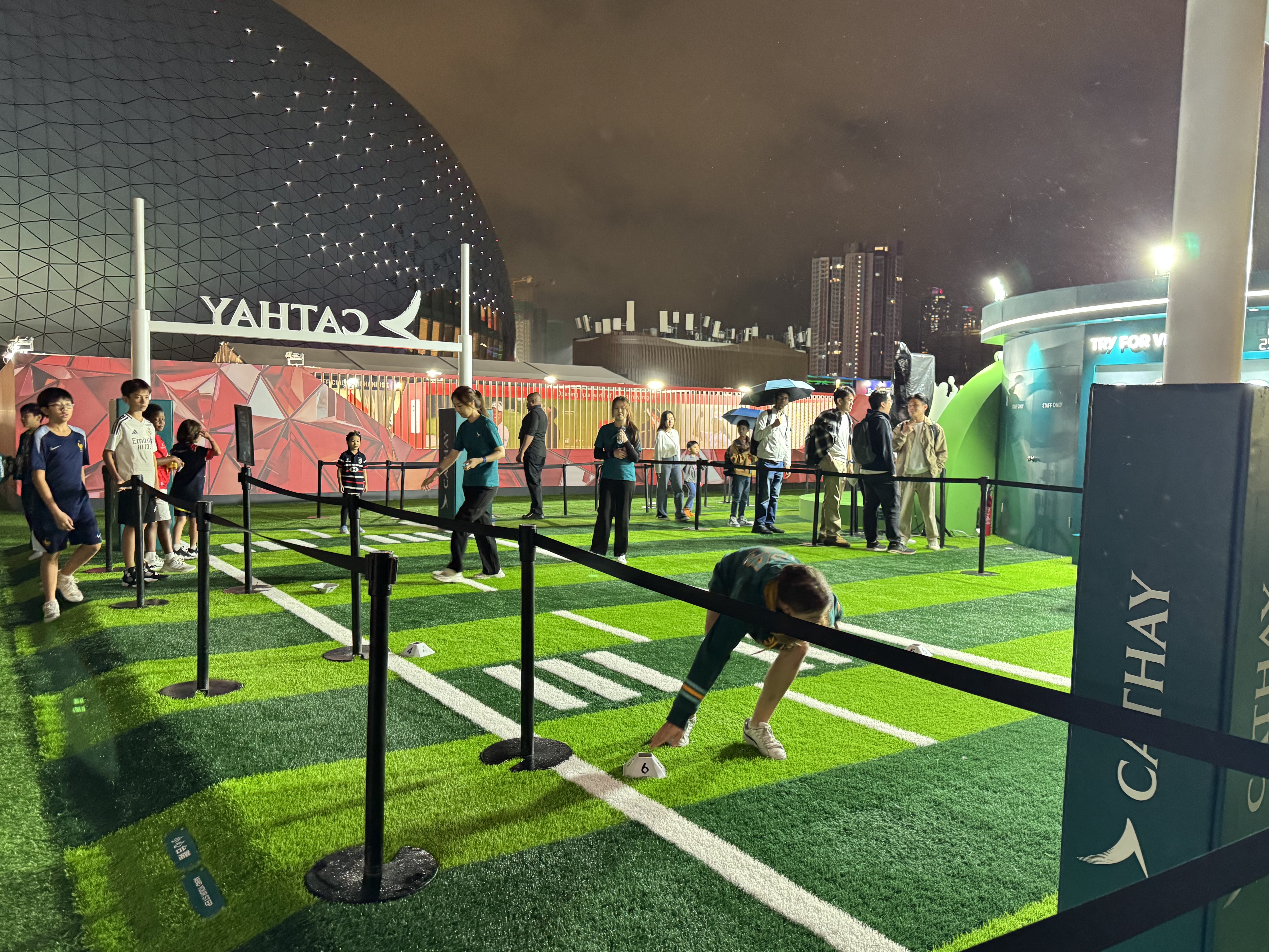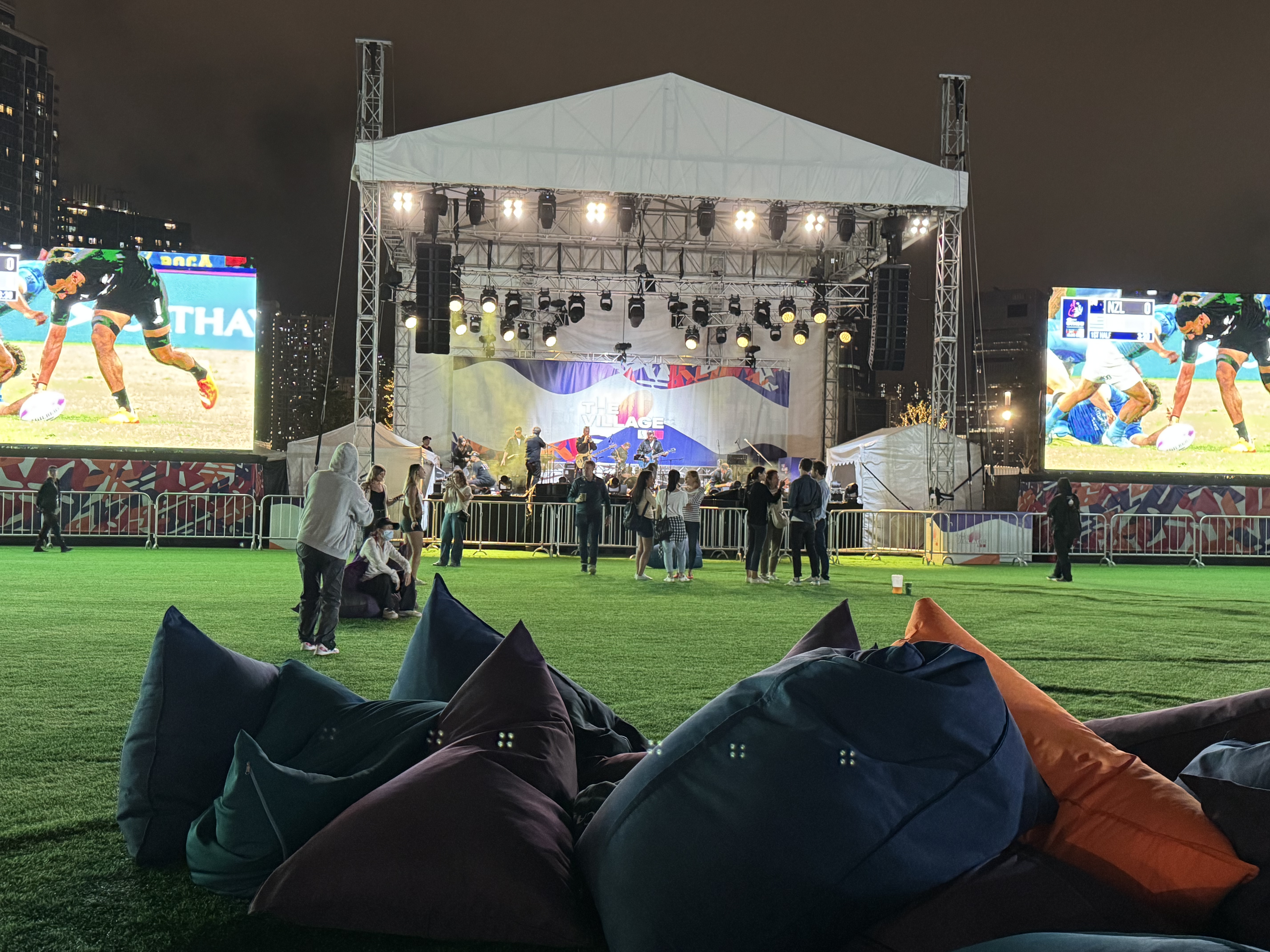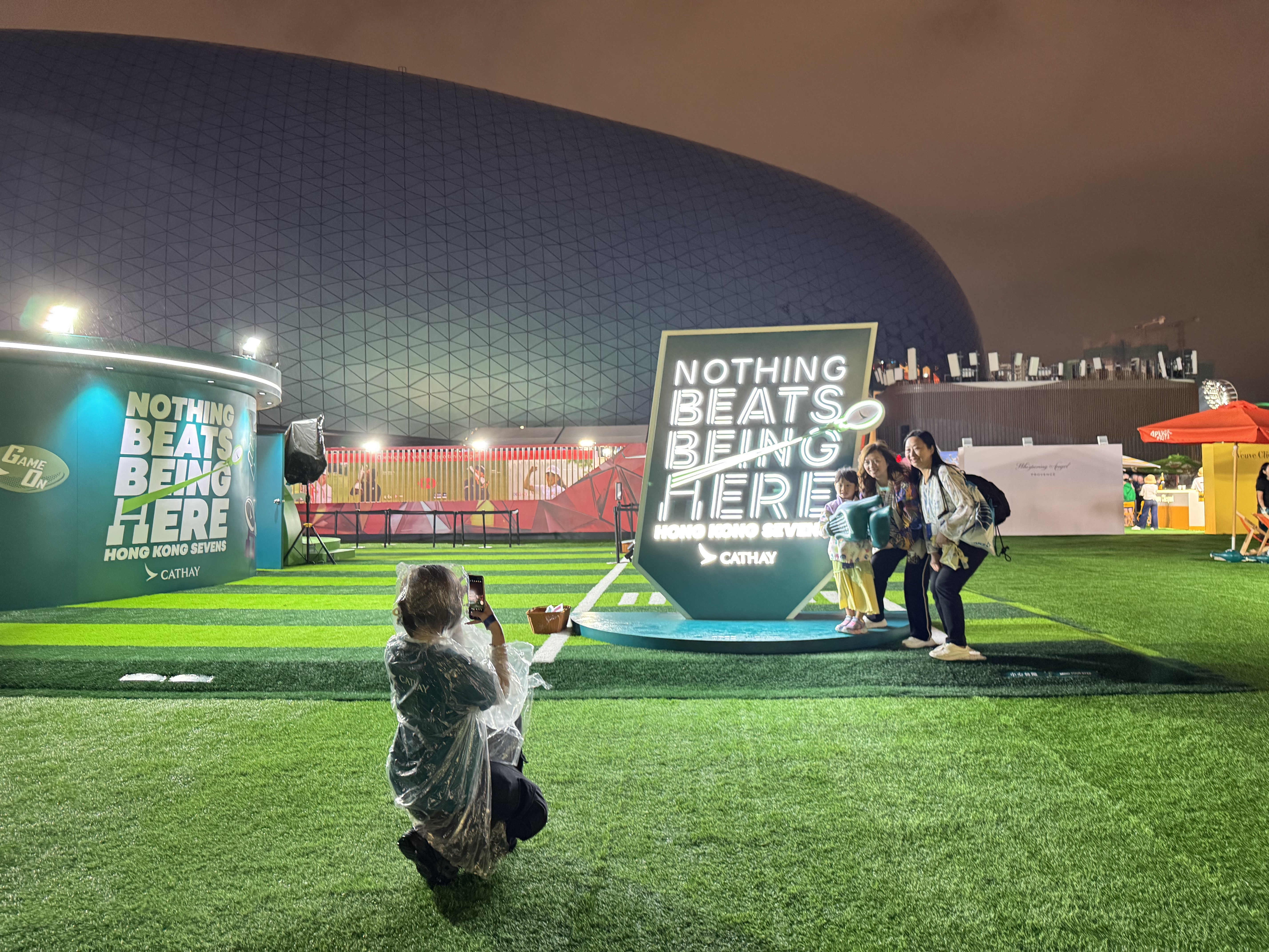 (大公文匯全媒體 記者 陳子萌)2025香港國際七人欖球賽(七欖)首次移師啟德體育園主場館舉行,並首次於場館外設置約7800平方呎的球迷村,內設餐飲攤位及表演舞台,大屏直播場內賽事,最多可容納約4000人,期間有15支樂隊及DJ獻藝。