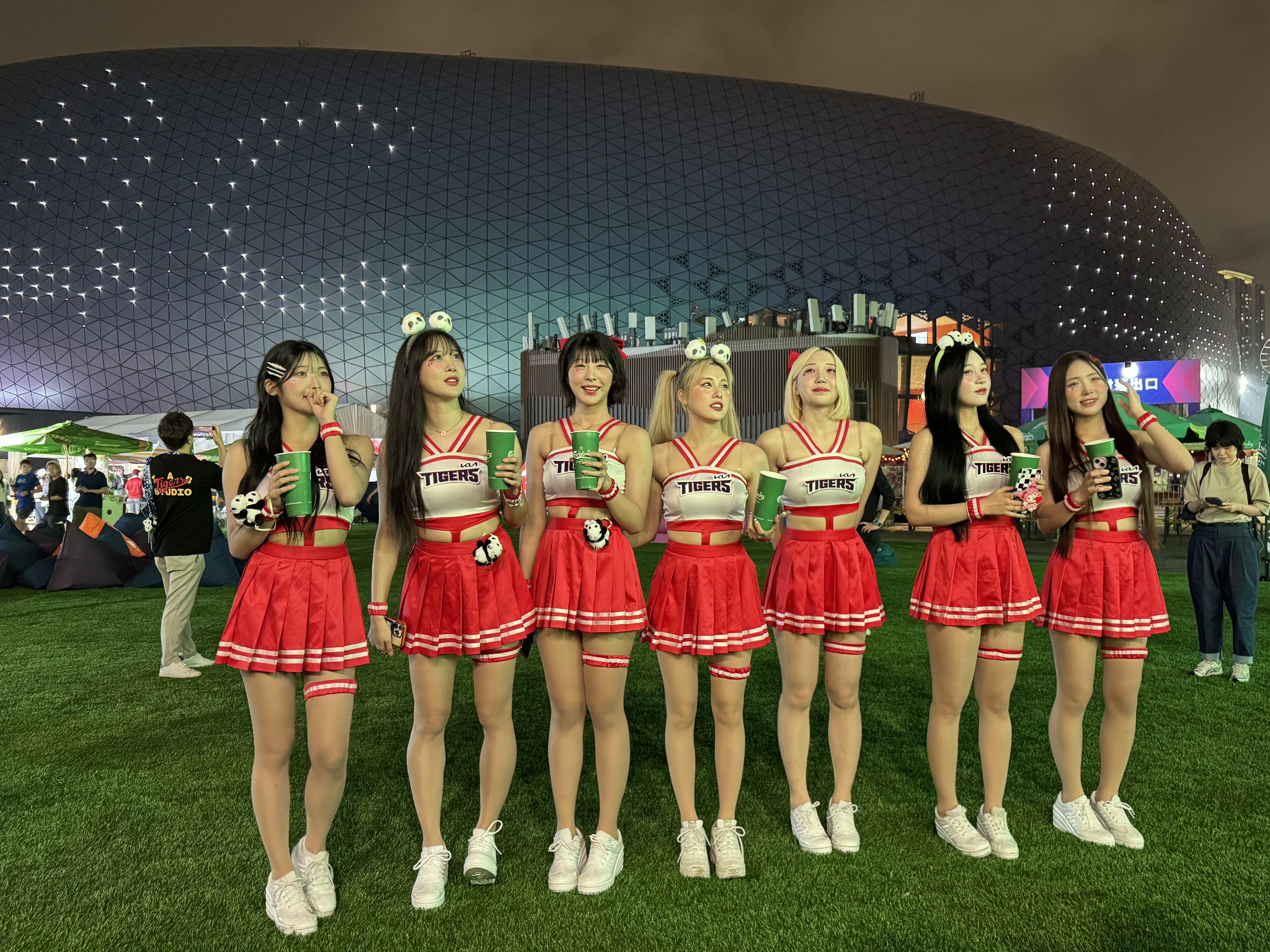 七欖盛事吸引世界各地的球迷前來觀賽,當然也少不了打卡設施,供球迷合影留念。而今日傍晚參加開幕典禮的韓國啦啦隊「起亞虎啦啦隊」成員也來到球迷村參觀打卡,她們與主場館同框,享受今晚盛事。