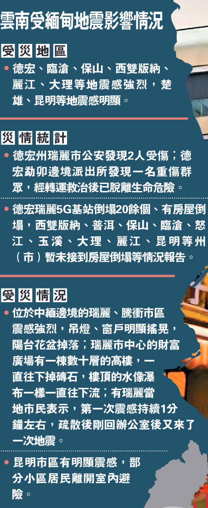 緬甸地震震中距中國邊境最近城市雲南德宏傣族景頗族自治州瑞麗市294公里,雲南多地有震感,當地消防、公安機關等救援力量開展受災情況摸排、人員搜救等工作,瑞麗市財富廣場一高樓坍塌嚴重。多地民眾回想起當時的情形,都還心有餘悸,「感覺與死神擦身而過」。