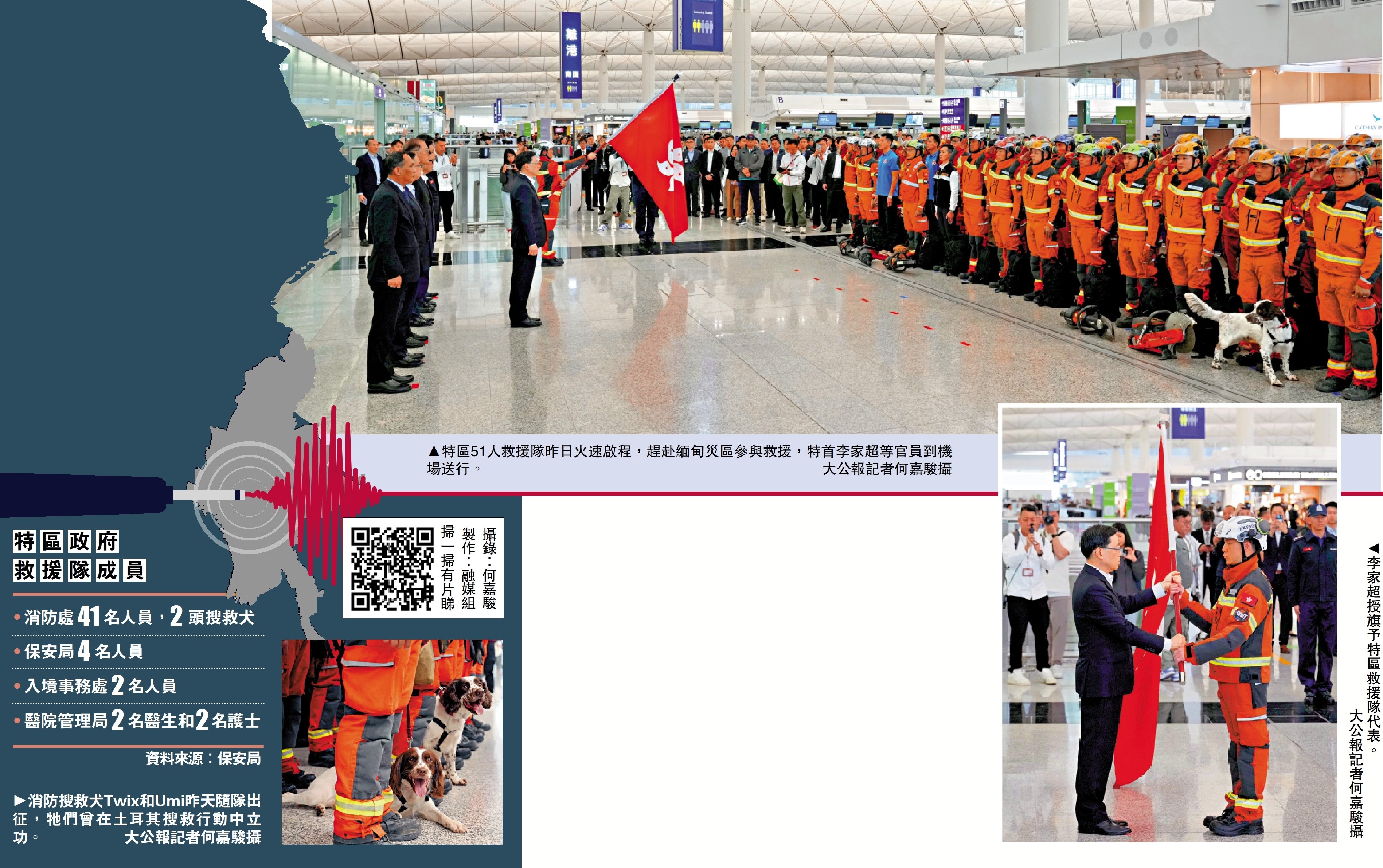 (大公報記者 伍軒沛、戴靜文)緬甸大地震造成重大人員傷亡及失蹤。特區政府派出51人救援隊,昨日火速啟程前赴緬甸參與救援,昨晚已抵達仰光國際機場。行政長官李家超在機場為救援隊送行時,讚揚救援隊無懼挑戰,無私勇敢,是香港的驕傲。特區政府已從賑災基金預留3000萬元,作為有關緊急賑災項目之用。