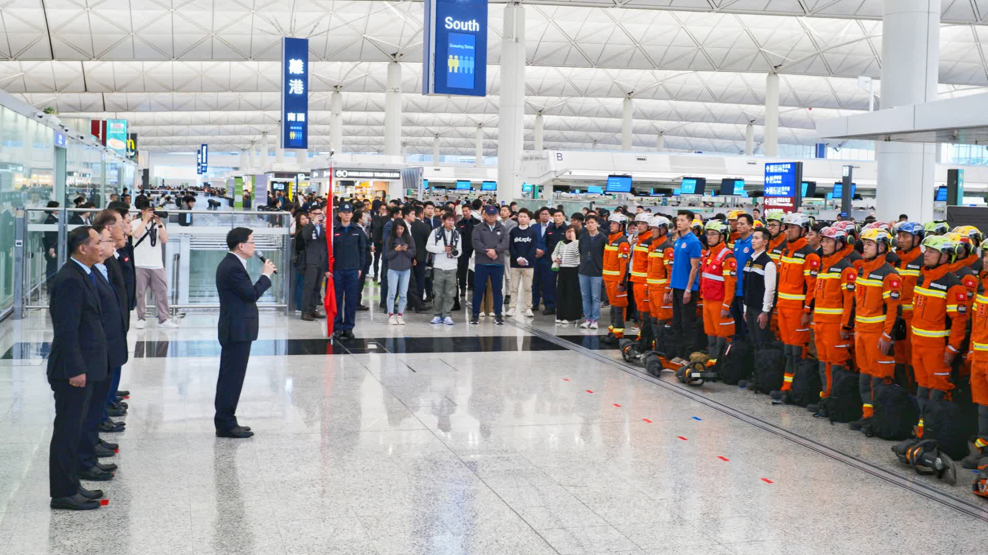 李家超在送行儀式上致辭時表示,他代表特區政府對緬甸當地遇難者致以深切悼念,並向遇難者家屬和災民致以深切慰問。特區政府收到緬甸駐香港總領事提出的請求後成立救援隊。他感謝每一位隊員迅速響應,在短短的應召時間內做好全面準備,並於昨天出發。