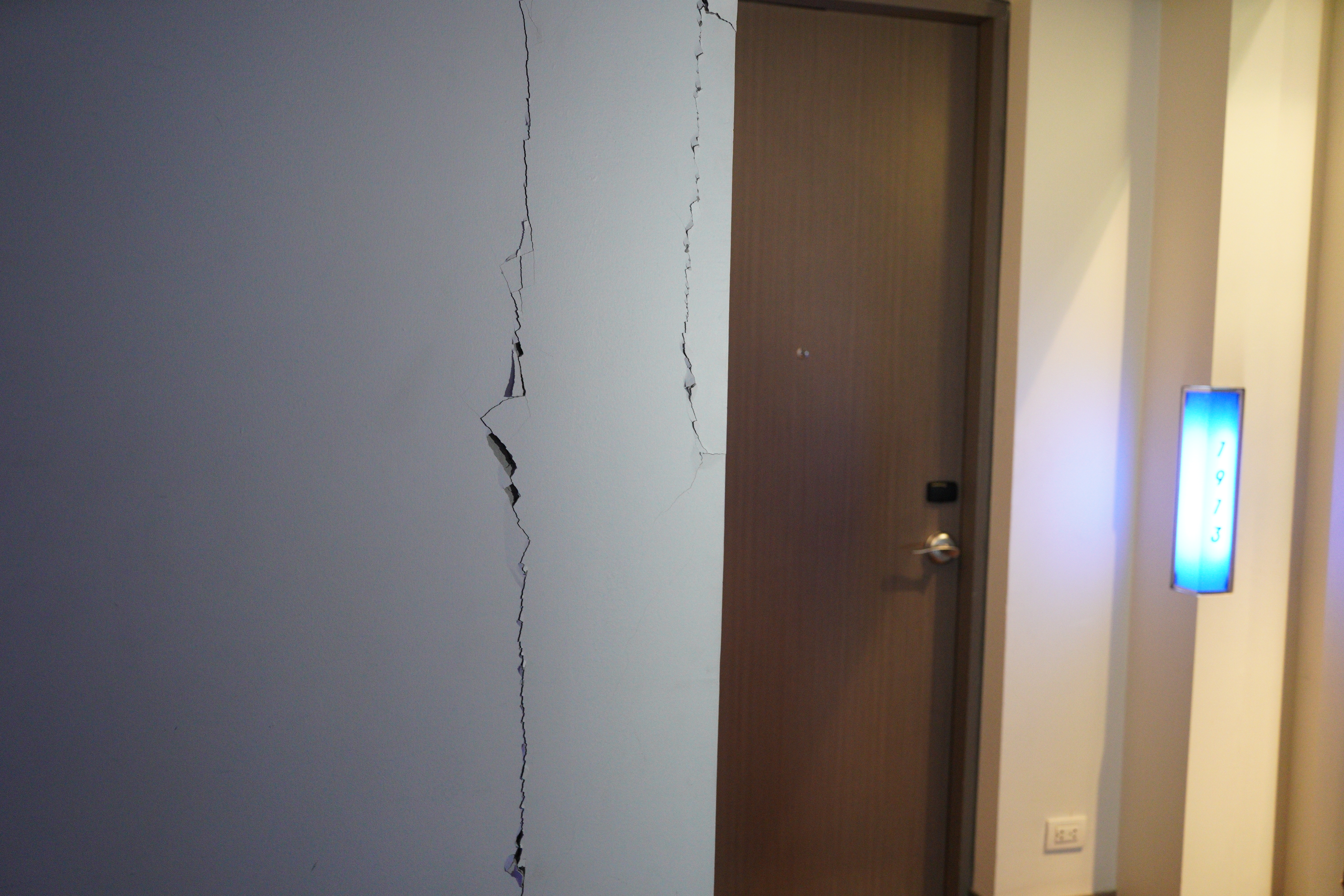 真正對地震有實感,是看到入住的酒店牆身有裂痕開始。不止我們入住的房間和樓層,這家位於曼谷鬧市區、29層樓高的酒店,每一層的走廊都是有裂縫的。裂縫有大有小,有些裂縫有手指粗,部分地方牆身批盪因為裂痕過大而掉落,露出裏面的水泥。在與編輯部溝通後,我們都認為酒店不安全,決定退房換另一間。
