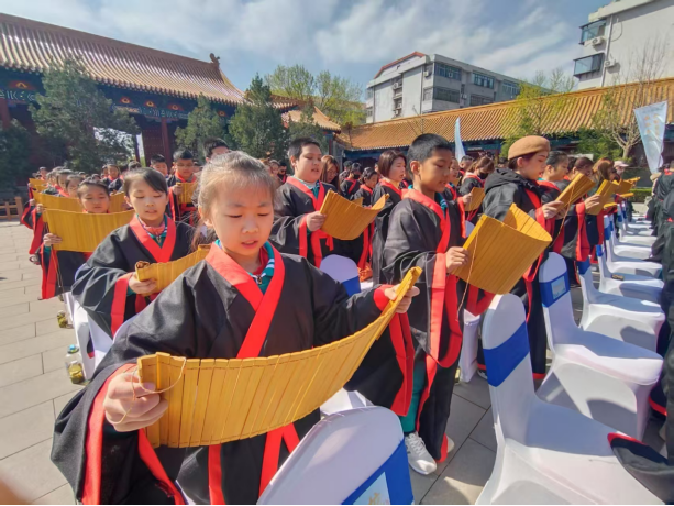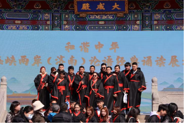 學而時習之,不亦說乎?有朋自遠方來,不亦樂乎……在大成殿前,來自台北、高雄、桃園、嘉義、南投等島內縣市的台灣同胞和濟南市天橋區制錦市街小學師生一起,身着漢服,手持竹簡,齊聲誦讀《論語》經典篇章。