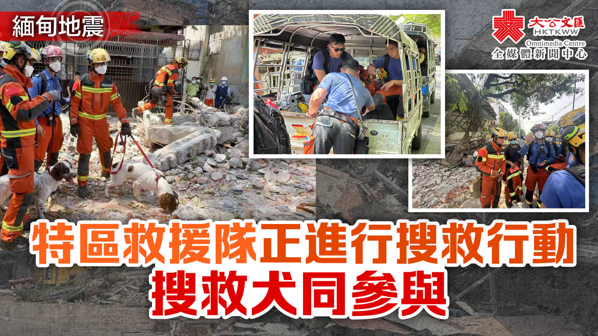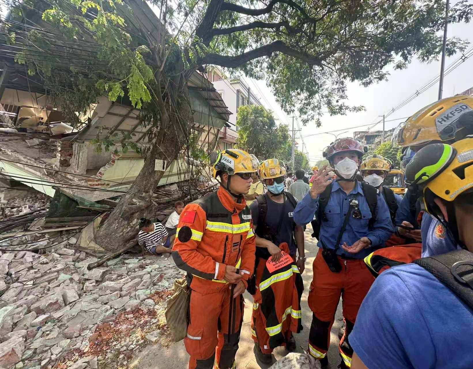 大公文匯全媒體報道,緬甸日前發生7.9級大地震,香港特區政府29日派出51人救援隊前往緬甸。保安局今日(31日)15時30分更新最新情況,特區救援隊帶上專業裝備及搜救犬,現正於曼德勒其中兩個受災區域進行搜救行動。