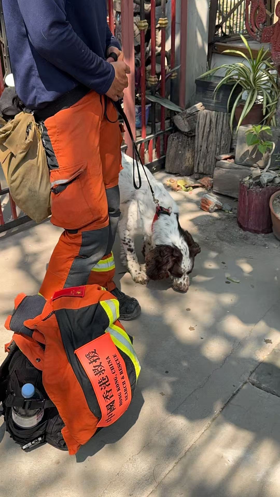 彭林表示,中國香港救援隊的隊員們來到現場大約是當地時間下午13時55分左右,下車的人員帶着破拆工具和一條搜救犬,有翻譯人員隨行。「他們應該也是過來先勘察有沒有生還者」。彭林稱,按照他現在了解的情況,救援是以救生還者為先。