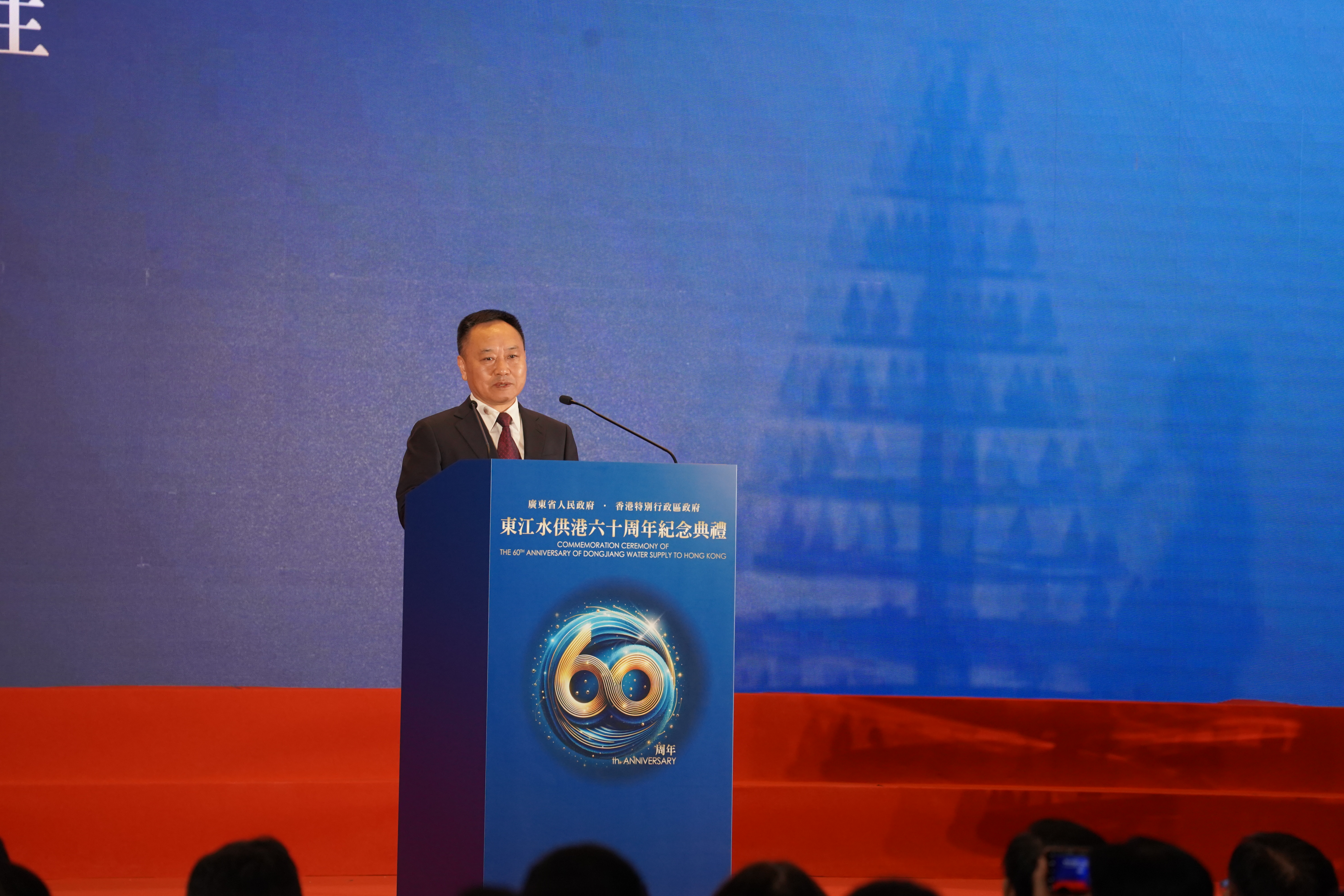廣東省省長王偉中在致辭時表示,黨和國家心繫香港繁榮發展、民生福祉。60年前,為解決香港水資源匱乏問題,在粵港沿線各地的共同努力下,黨和國家建設全長83公里的供水工程,終結了香港嚴重缺水的歷史。60年來,黨中央把對港供水安全作為重要使命抓好、抓實。伴隨香港人口持續增加,經濟快速發展,年供水量達到了如今的24.23億立方米,累計對港供水超過300億立方米,佔港用水量超過八成。源源不斷的東江水見證了粵港兩地的深情厚誼,也見證了兩地的騰飛發展。在水脈的連結下,粵港各領域不斷深化合作。一個世界級城市群正在南海之濱冉冉升起。我們將以水為紐帶,共同做好大灣區建設這篇大文章,與香港實現物流、人流、信息流等方面的流通。