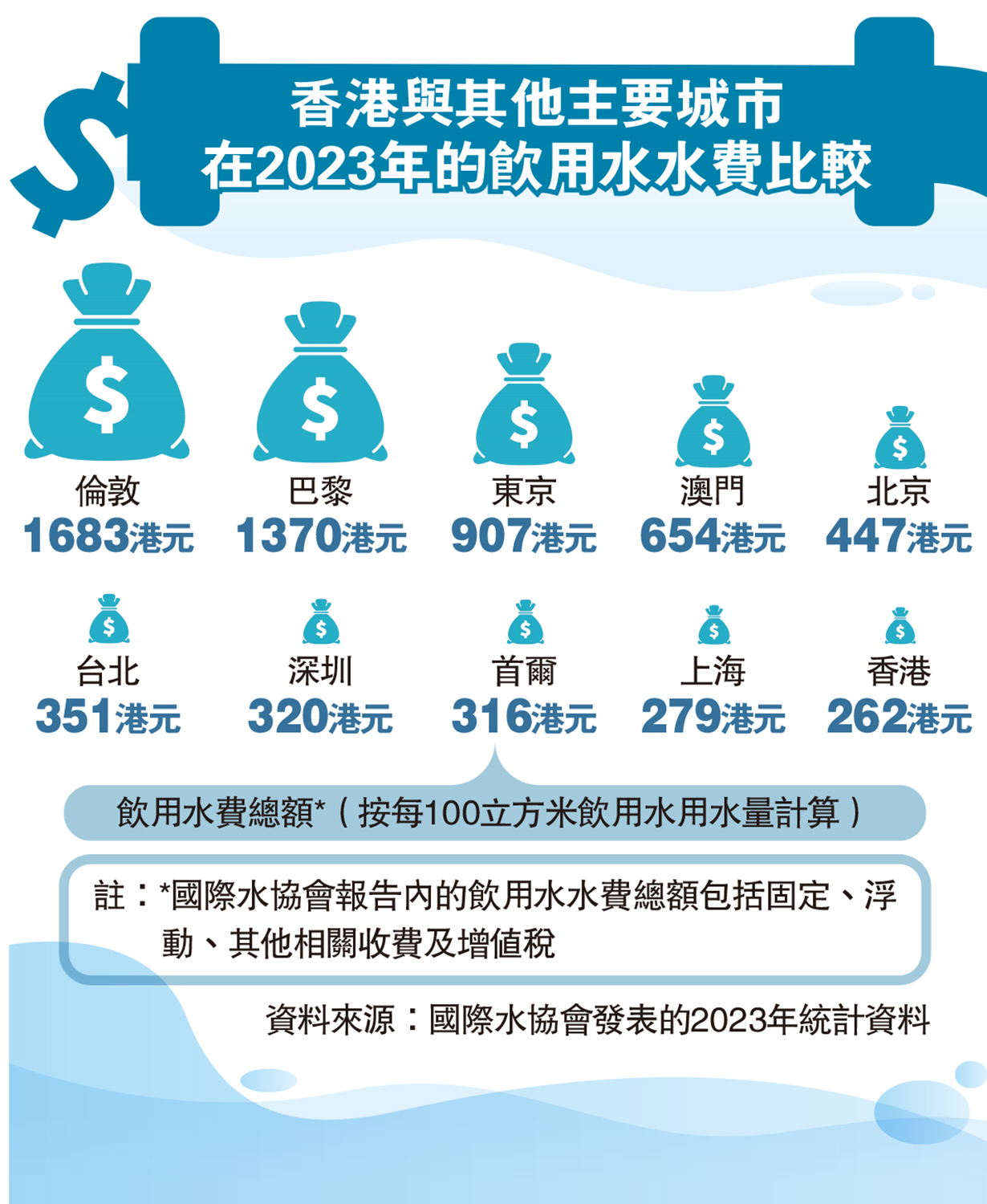 香港作為國際大都會,無論是經濟發展還是民生,各方面都需要穩定供水。全球淡水資源珍貴,香港能全天候打開水龍頭就有水出,全賴東江水的支撐。根據2023年國際水協會發表的資料顯示,香港每100立方米的飲用水水費僅需262港元,對比其他先進國家的城市,東京907港元、巴黎1370港元,倫敦1683港元,都比香港高出數倍。