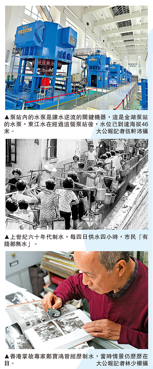 沒有東江水,香港連基本的飲用水都成問題,沒有水清潔,衞生情況惡劣,「民生都過不好,何來經濟起飛?決成不了亞洲四小龍。」香港掌故專家鄭寶鴻曾經歷制水,深明淡水資源對香港的重要性。60年前,他僅得幾歲,看見人們為爭一口水而大打出手,當時情景仍歷歷在目,「每次輪水,大家就拎齊家中的水桶、鐵罐到街邊排隊。每次供水只有4小時,數百上千人大排長龍的景象,非常誇張。」