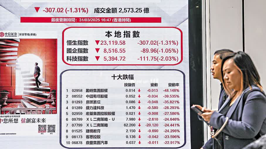 華富建業證券投資策略聯席總監阮子曦說,港股首季表現突出,但本周情勢風高浪急,主要因4月2日美國將實施其「對等關稅」計劃,令市場胃納及想法都呈較負面的方向。亞太區主要股市下挫,日股更創去年9月以來的最大單日跌幅,連台股也跌逾4%,見逾7個月低位。他認為,恒指一旦失守23,000點,預估下一個防守線將下移至50天線,即約22,400點附近。