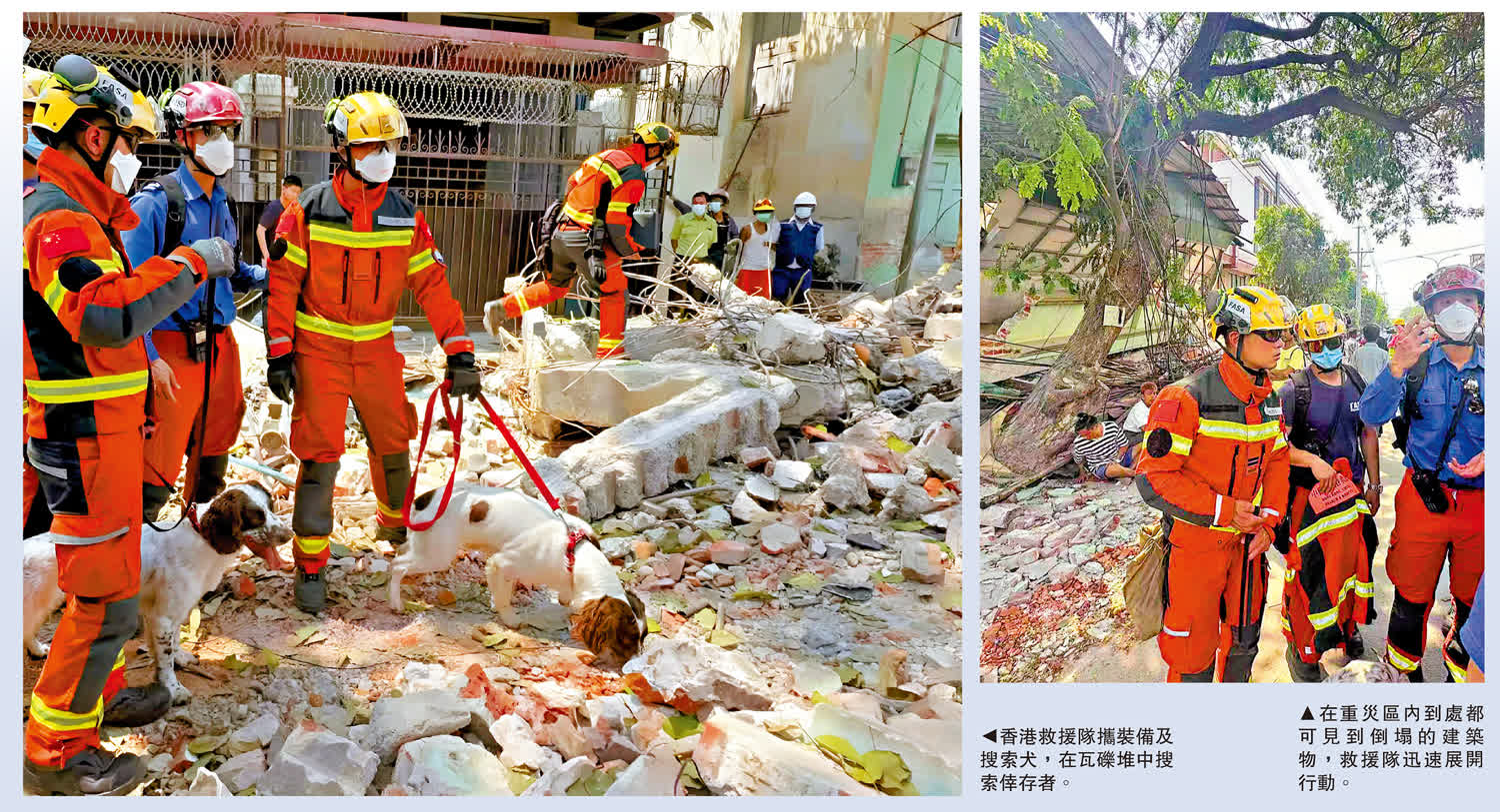大公報現場連線報道。緬甸世紀大地震重創當地的建築和道路設施,位處震央區的第二大城市曼德勒滿目瘡痍,餘震不斷,出現大量傷亡,救援刻不容緩。香港特區政府派出的救援隊前日下午抵達緬甸首都內比都後,原計劃展開救援工作,後經緬甸當局指派,改往270公里外的重災區曼德勒,救援隊連夜動身啟程,惟因路面宵禁,至昨日中午才抵達曼德勒,特區救援隊與國家救援隊會合後,隨後前往不同災區爭分奪秒搜救,在坍塌的建築物尋找「生機」。點擊閱讀詳情