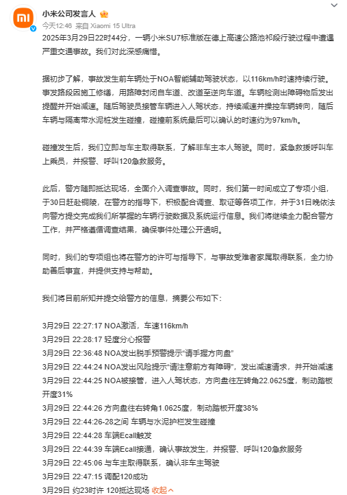 4月1日,小米公布事故信息摘要。小米汽車客服人員回應此事稱,「目前公司已經成立專門工作小組趕赴現場,會全力配合警方和家屬對事故進行詳細的還原調查,協助家屬處理後續情況,將根據後續實際調查情況在官方渠道公布」。