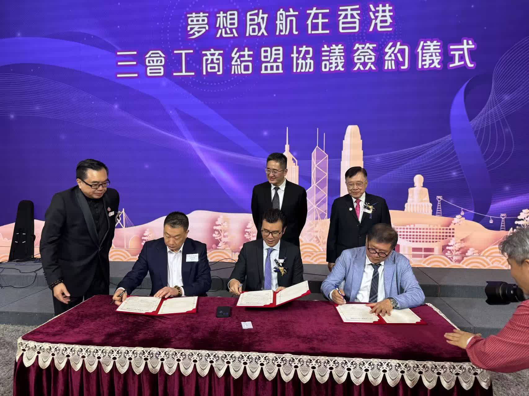 在陳百里、李鋈麟及吳為贊的見證下,紅磡土瓜灣(九龍城)工商聯創會會長王子維、銅鑼灣工商聯會長陳偉強與北區工商聯會長張玉麒上台進行夢想啟航三會工商結盟協議簽約儀式。