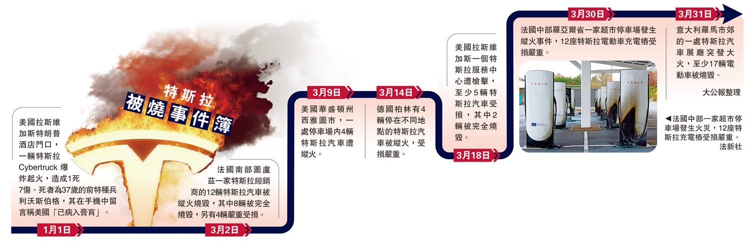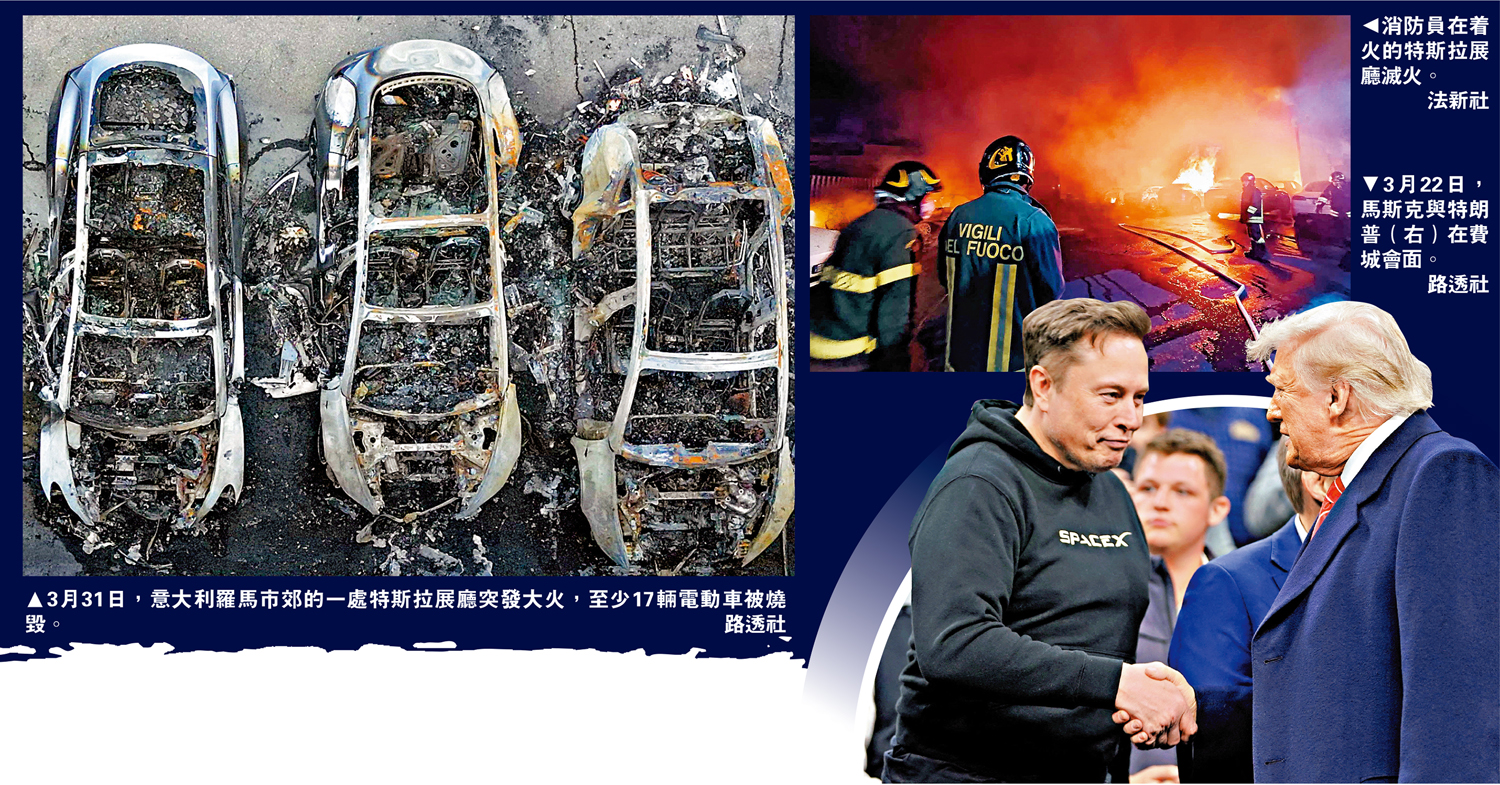 與此同時,針對特斯拉的暴力事件也有所增加。3月31日,意大利羅馬市郊的一處特斯拉汽車展廳突發大火,至少17輛電動車被燒毀。3月30日,法國中部羅亞爾省一家超市停車場發生縱火事件,12座特斯拉電動車充電樁受損嚴重。3月29日,德國西北部一家特斯拉汽車經銷店發生火災,7輛車被燒毀。
