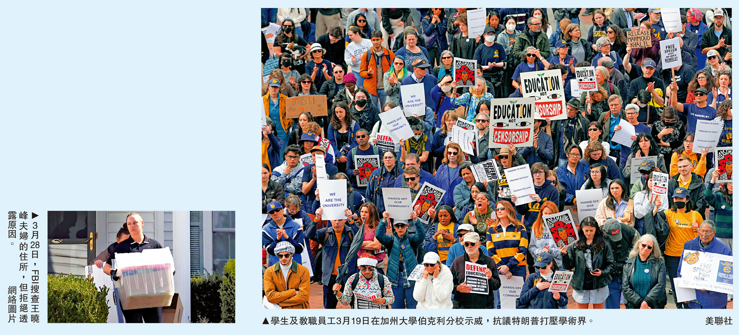 大公報報道,美國聯邦調查局(FBI)日前突擊搜查印第安納大學知名華裔教授王曉峰的住所,印第安納大學同日將王曉峰開除,但FBI和校方均未給出正當理由,令外界擔憂臭名昭著的「中國行動計劃」隨着美國總統特朗普重返白宮而死灰復燃。美國大學教授協會表示,印第安納大學不由分說解僱一位終身教授的做法違反規定。美國其他高校的學者亦在社交媒體上表示擔憂。有報道指出,美國政府無理打壓華裔學者,近期回流中國的學者顯著增加。