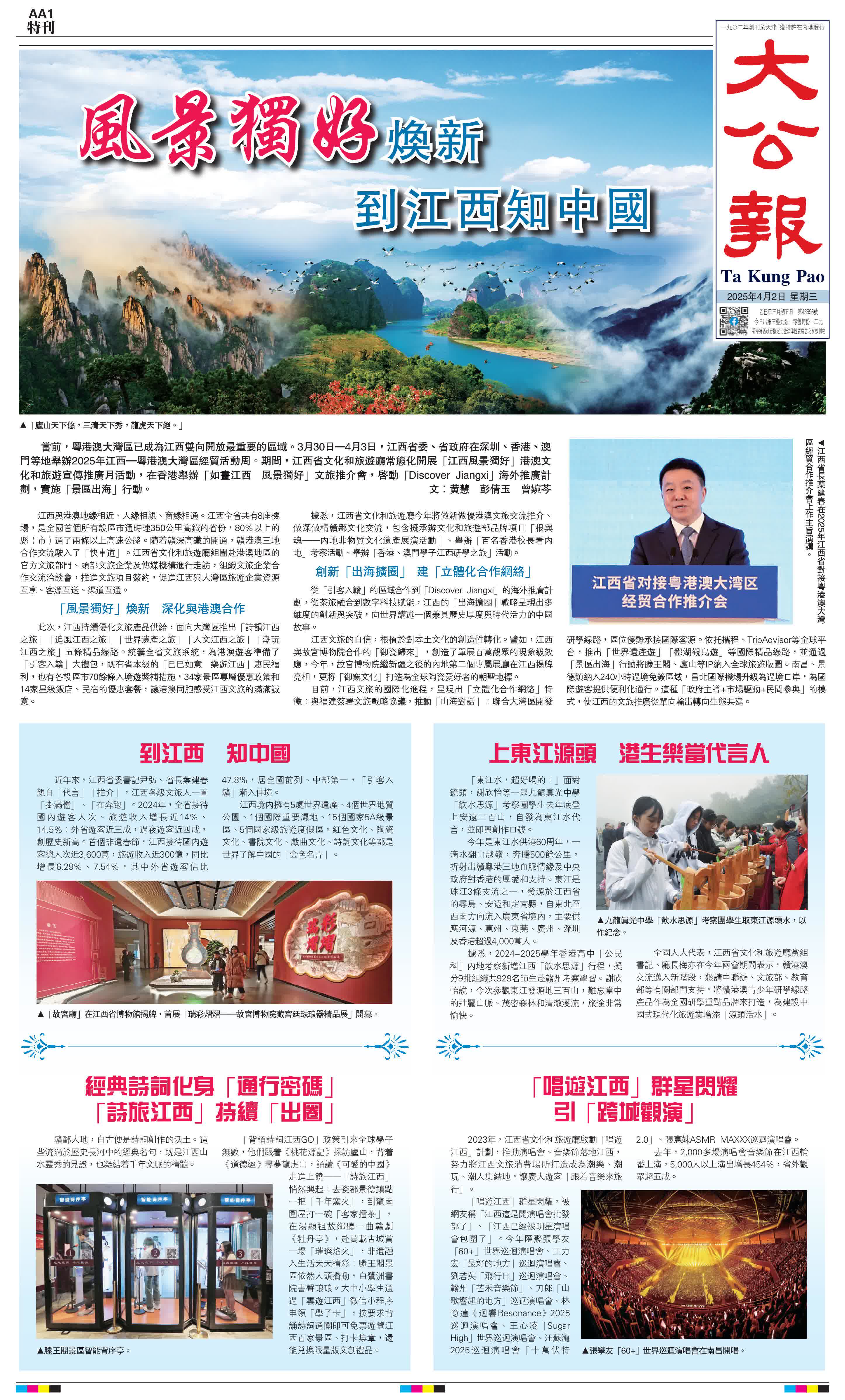當前,粵港澳大灣區已成為江西雙向開放最重要的區域。3月30日—4月3日,江西省委、省政府在深圳、香港、澳門等地舉辦2025年江西—粵港澳大灣區經貿活動周。期間,江西省文化和旅遊廳常態化開展「江西風景獨好」港澳文化和旅遊宣傳推廣月活動,在香港舉辦「如畫江西風景獨好」文旅推介會,啟動「Discover Jiangxi」海外推廣計劃,實施「景區出海」行動。