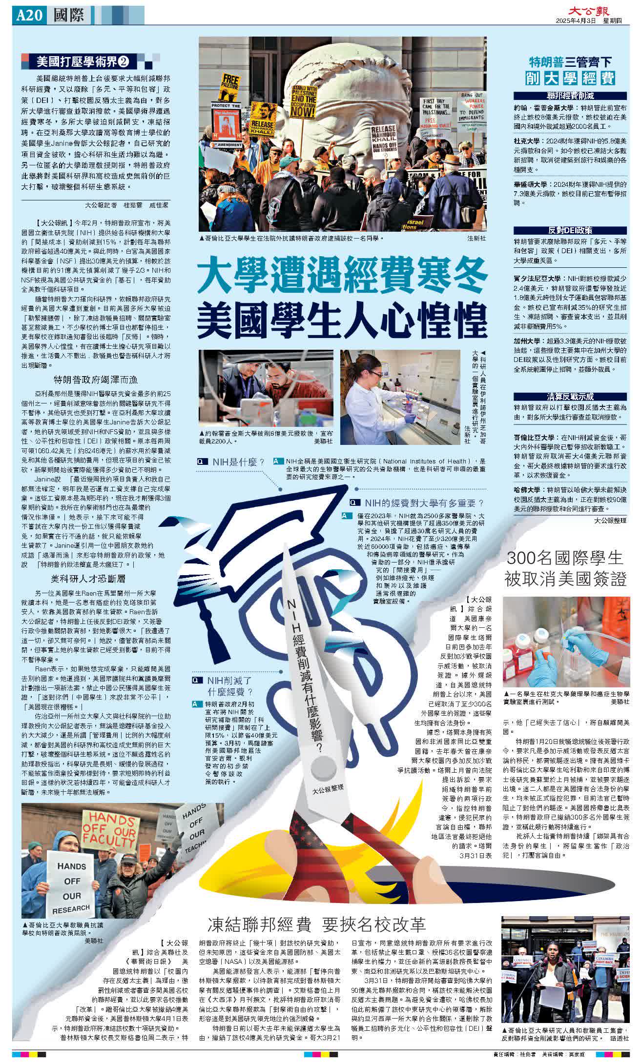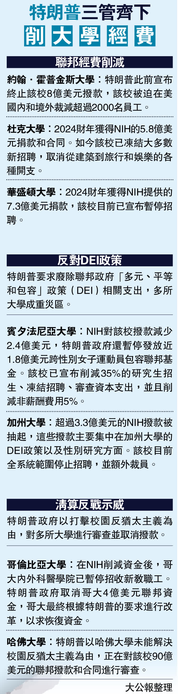大公報綜合美聯社及《華爾街日報》:美國總統特朗普以「校園內存在反猶太主義」為理由,懲罰性削減或者審查多間美國名校的聯邦經費,並以此要求各校推動「改革」。繼哥倫比亞大學被撤銷4億美元聯邦資金後,美國普林斯頓大學4月1日表示,特朗普政府將凍結該校數十項研究資助。