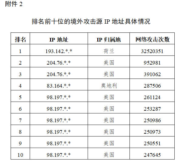 境外網絡攻擊IP地址中,歸屬於荷蘭的IP地址(193.142.*.*)以32520351次攻擊高居首位,美國有多個IP地址對黑龍江省關鍵信息基礎設施開展網絡攻擊,單個IP地址的攻擊次數少於上述荷蘭IP地址,但攻擊總次數則相對較高。