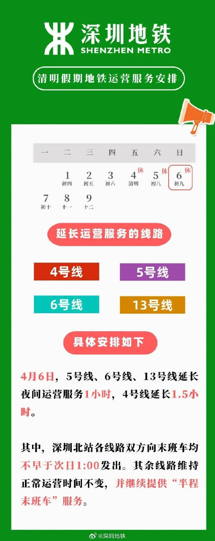 4月6日(周日)深圳市地鐵5、6、13號線延長夜間運營服務1小時,4號線延長約1.5小時。其中,深圳北站各線路雙方向末班車均不早於次日1:00發出。其餘線路維持正常運營時間不變,並繼續提供「半程末班車」服務。