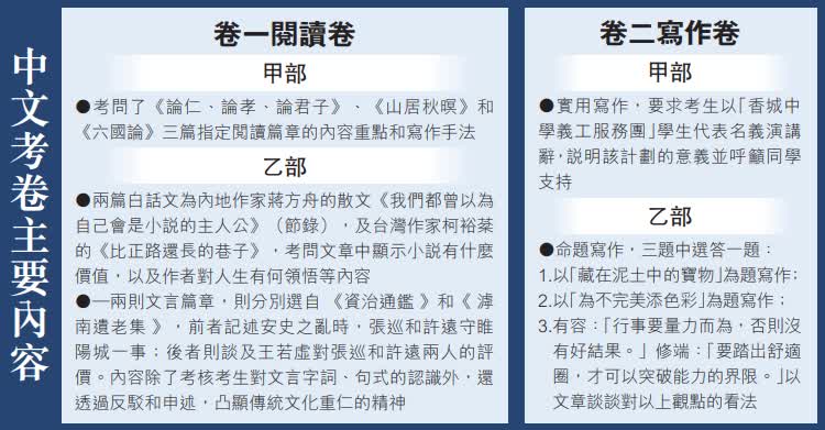 其中閱讀卷除了甲部字詞解釋和名言摘錄外,亦考問了《論仁、論孝、論君子》、《山居秋暝》和《六國論》;乙部則是白話文,及選自《資治通鑑》和《滹南遺老集》的文言篇章。