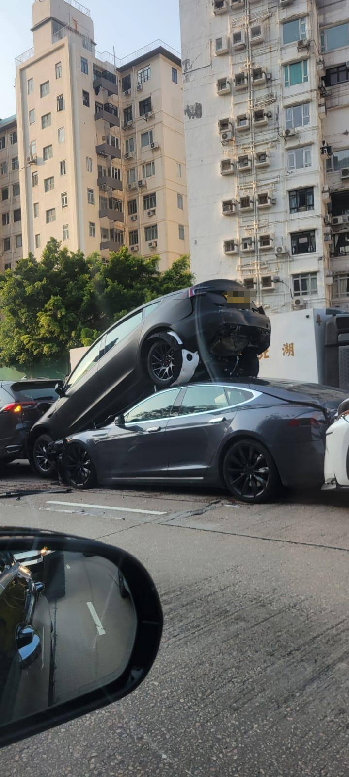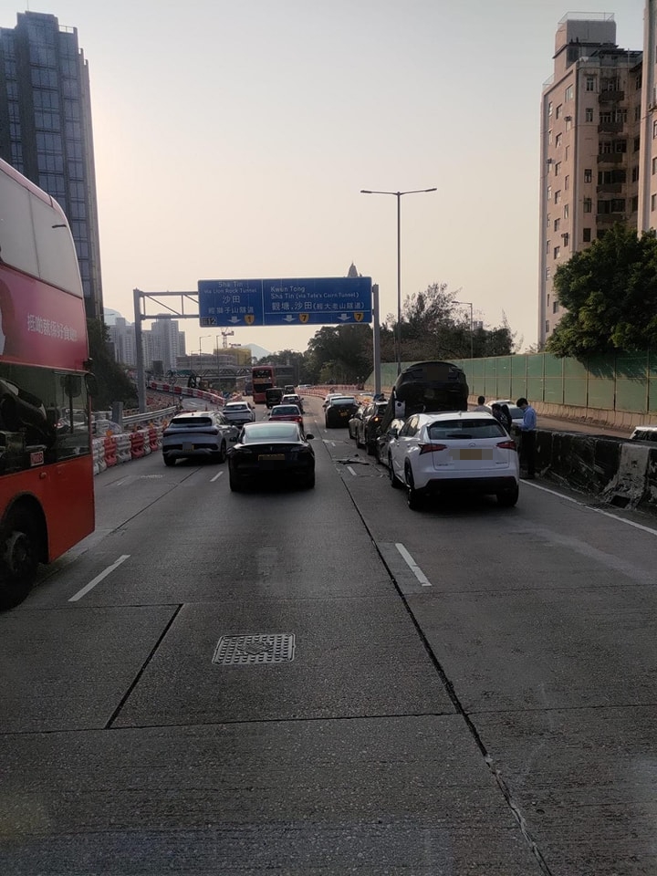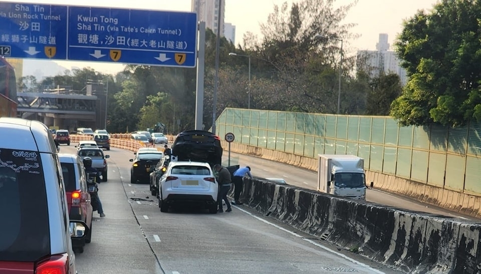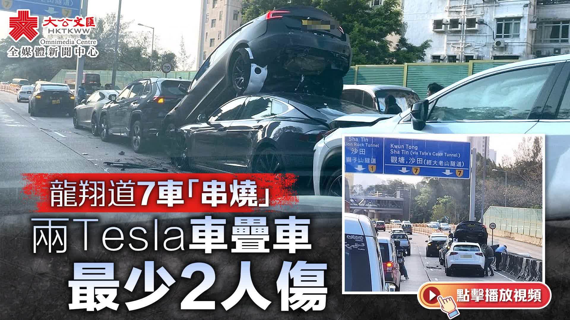 大公文匯全媒體報道,黃大仙今(3日)早發生多宗交通意外。上午7時34分,龍翔道往觀塘方向近龍翔道公園對開,共有7輛私家車相撞,其中一輛Tesla電動車更被撞至「炒起」,車尾離地疊住後車車頂。救援人員接報到場,初步消息一名司機頸部受傷,一名女子腳部受傷,警員正就意外原因展開調查。