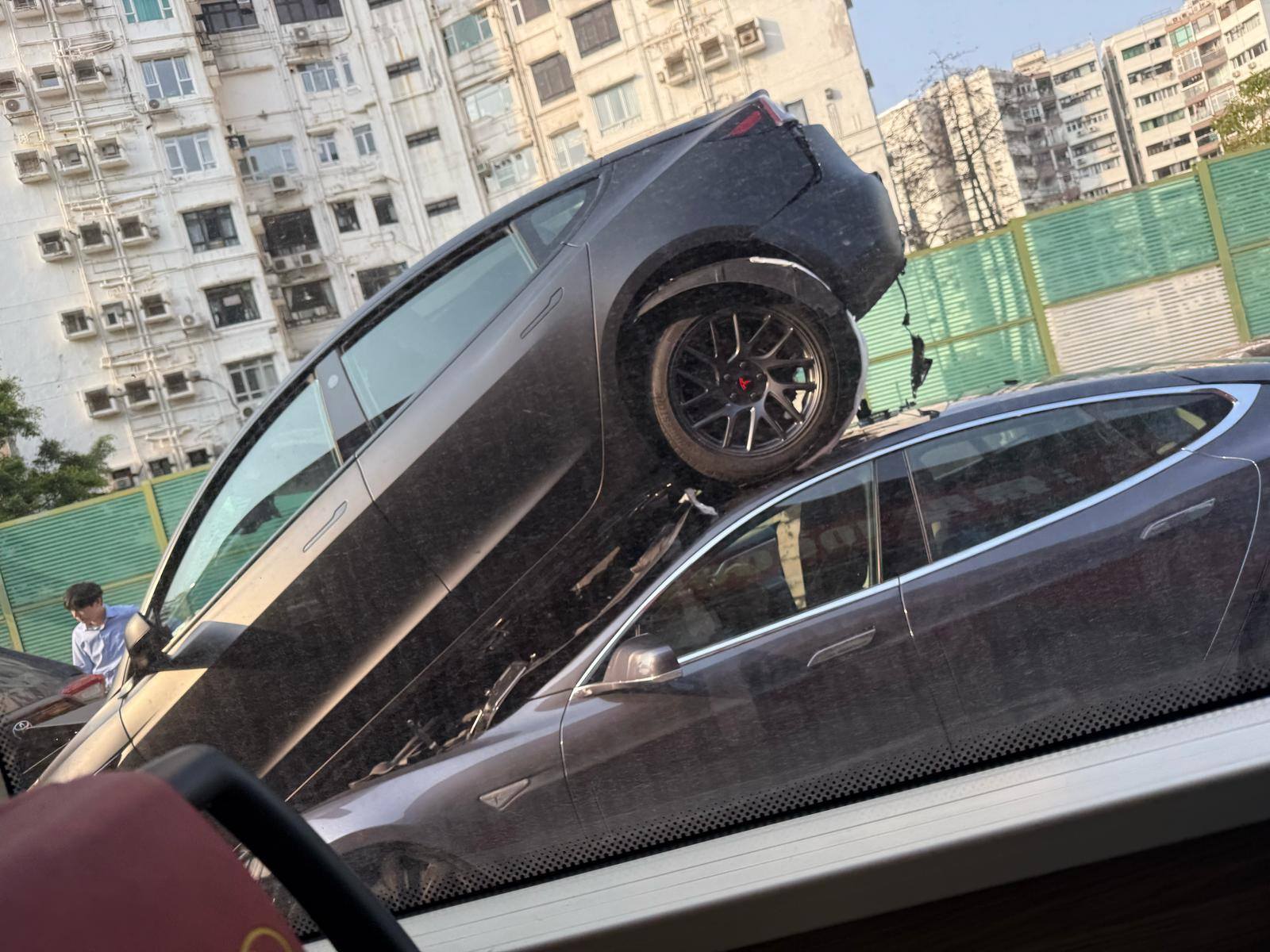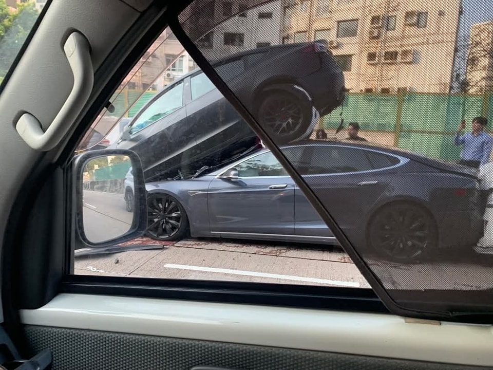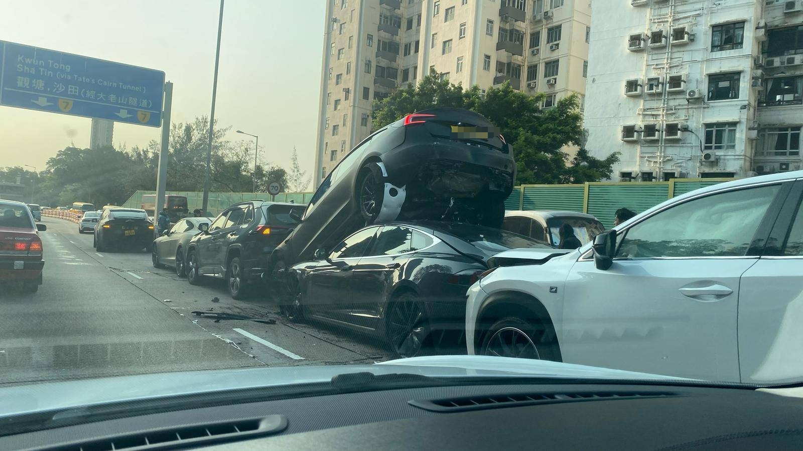 大公文匯全媒體報道,黃大仙今(3日)早發生多宗交通意外。上午7時34分,龍翔道往觀塘方向近龍翔道公園對開,共有7輛私家車相撞,其中一輛Tesla電動車更被撞至「炒起」,車尾離地疊住後車車頂。救援人員接報到場,初步消息一名司機頸部受傷,一名女子腳部受傷,警員正就意外原因展開調查。