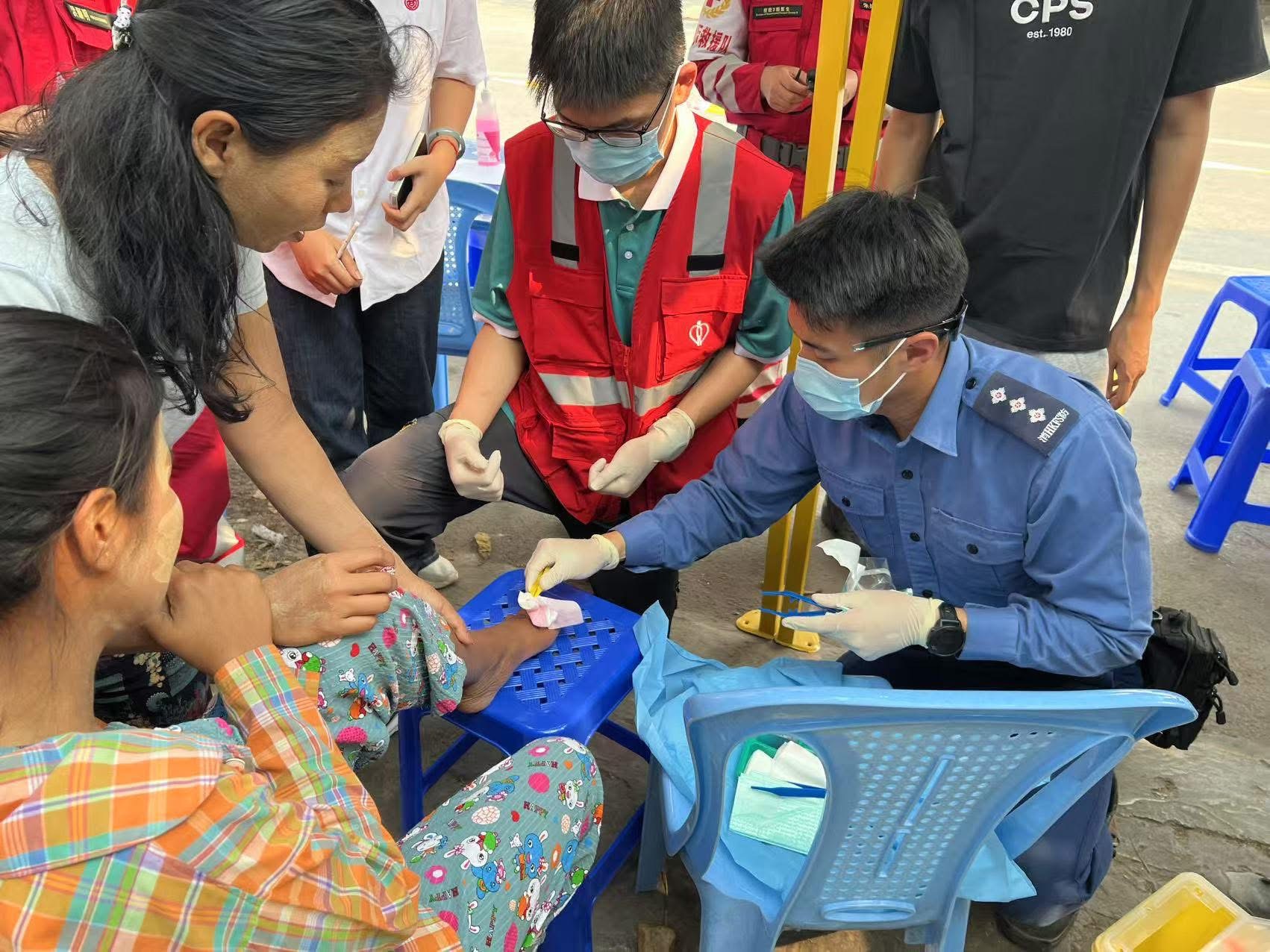 保安局指,許多於地震中受傷的災民前來求助,救援隊帶同合適的醫療裝備,如量度維生指數的儀器、處理傷口的消毒用品等,協助災民處理傷患同提供藥物。