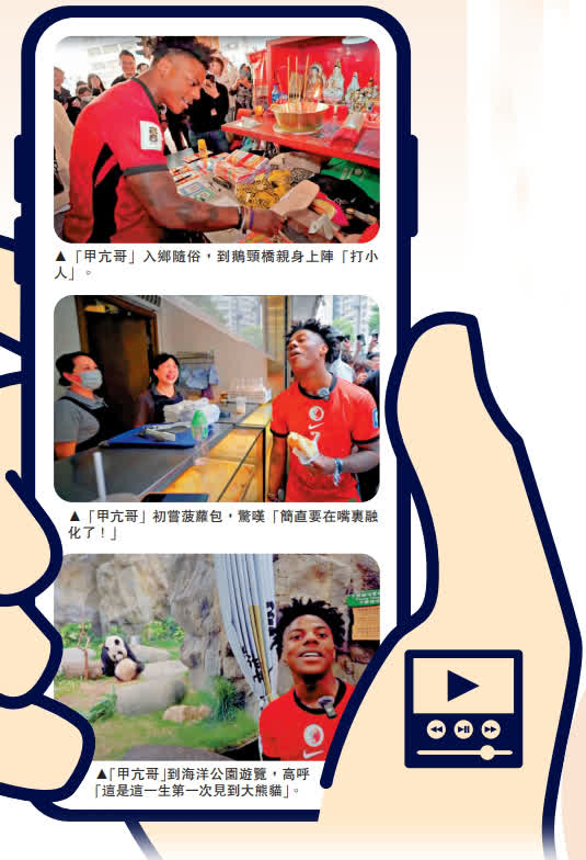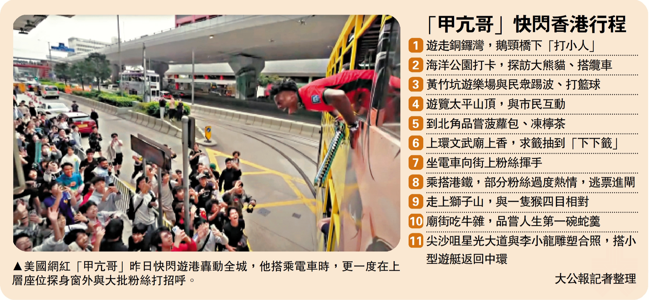 (大公報記者 賴振雄)美國網紅IShowSpeed(簡稱Speed,中文昵稱「甲亢哥」)早前到中國內地旅遊,引發全球網民的關注,他昨日在香港「快閃」港九多區,先後到訪海洋公園看大熊貓、灣仔鵝頸橋體驗打小人、上環文武廟求籤上香,並品嘗香港多種地道美食,讚不絕口,當吃下第一口菠蘿包時,更驚呼「簡直要在嘴裏融化了!」