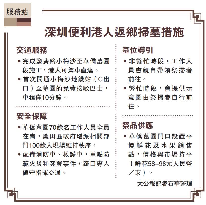 值得一提的是,今年,鹽葵路小梅沙至華僑墓園的道路施工已經完成,為港人祭掃帶來了極大的便利。去年港人需從溪涌出口駛出再入園,如今可直接抵達,節省了近半小時的車程。特別是在節假日或周末時段,鹽田區梅沙街道辦、墓園管理處首次提供了免費巴士服務。港人只需乘坐地鐵至小梅沙站,從C出口出站後,乘坐巴士僅需十分鐘即可輕鬆抵達墓園,大大減少了祭掃途中的奔波。
