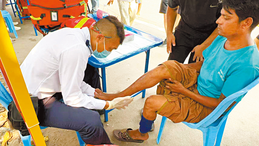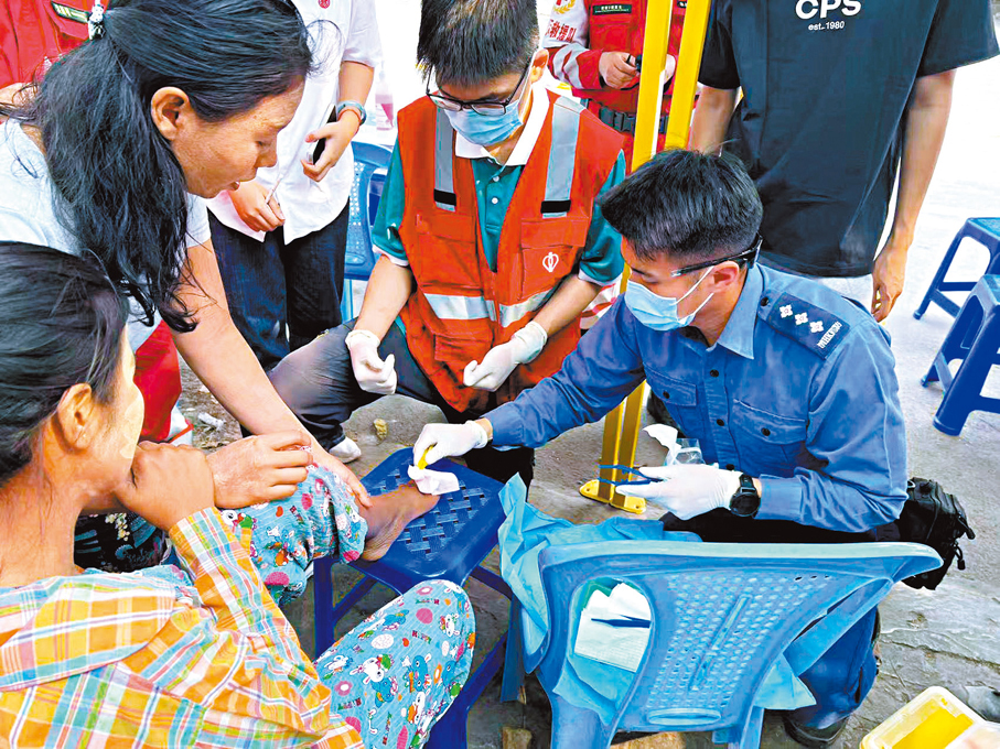 (香港文匯報記者 劉啟業)香港特區救援隊連日來在緬甸地震災區曼德勒巿進行搜救工作,而救援隊中由8人組成的醫療團隊,在為搜救人員提供健康保障的同時,於昨日聯同國家救援隊為災民提供義診服務,為有需要人士提供檢查和建議。參與義診服務的消防處高級救護主任蕭景輝在接受香港文匯報專訪時表示,有逃生時受輕傷的老婦獲治療後合十表達感恩,自己深受感動。隨隊的醫院管理局急症科統籌委員會主席蕭粵中醫生表示,雖然當地高溫兼蚊患嚴重,且進行搜救的隊員連日來高強度工作,但醫護人員有監察救援隊隊員健康情況並提供意見,故隊員整體健康情況理想。